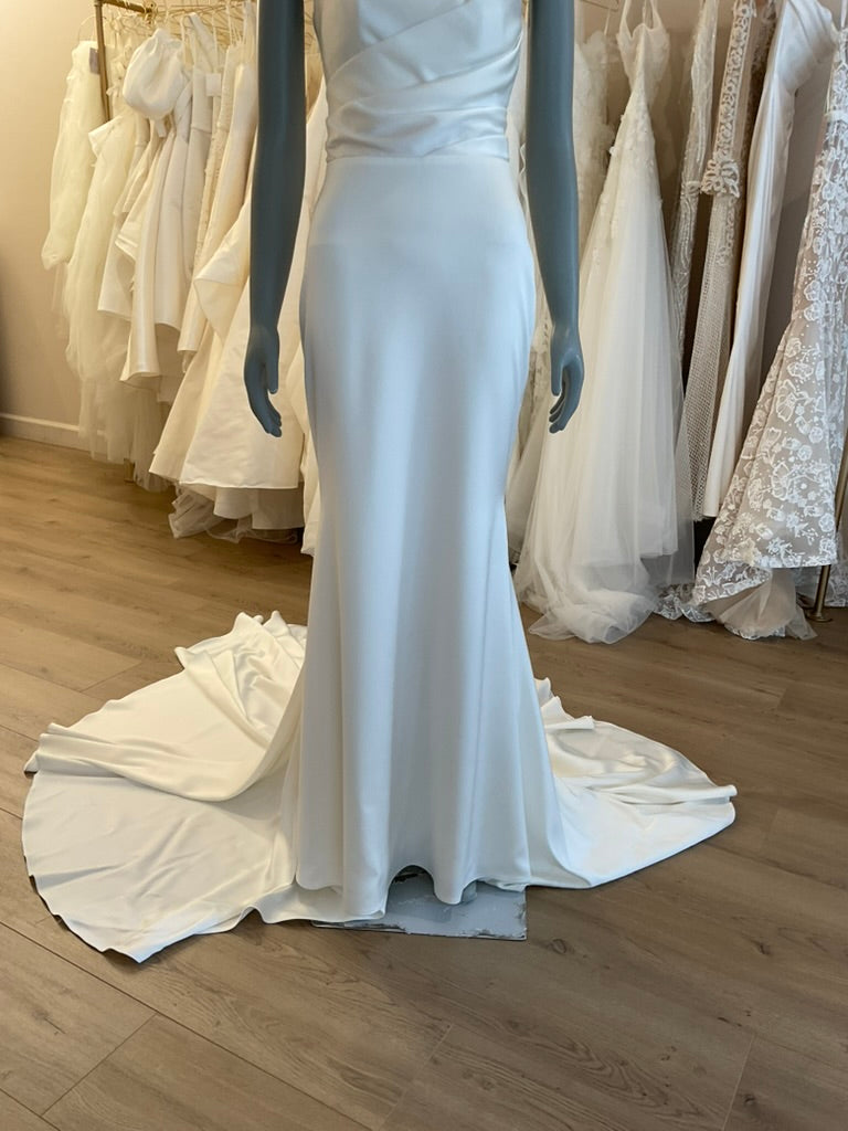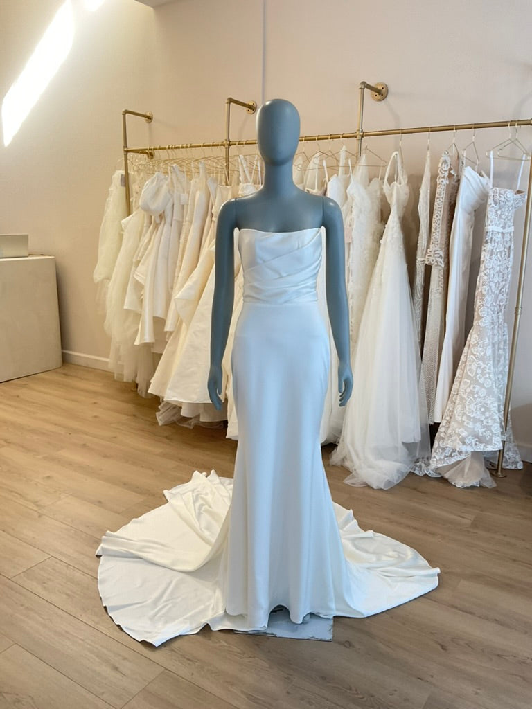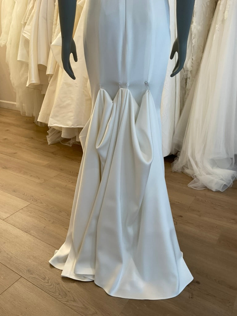 The Lihi Hod Adele gown is the epitome of modern elegance and timeless sophistication. Crafted from luxurious silk satin, this strapless beauty features a beautifully draped cowl neckline that highlights the decolletage with soft femininity. The sleek, fitted silhouette hugs the body in all the right places before falling into a gentle flare, creating a statuesque and graceful shape. A subtle waistband accentuates the waist, adding delicate structure while maintaining an effortlessly chic look. Perfect for the minimalist bride with a love for clean lines and refined details, the Adele is a stunning choice for a stylish walk down the aisle.