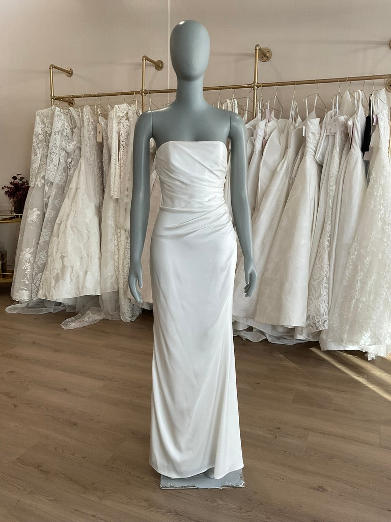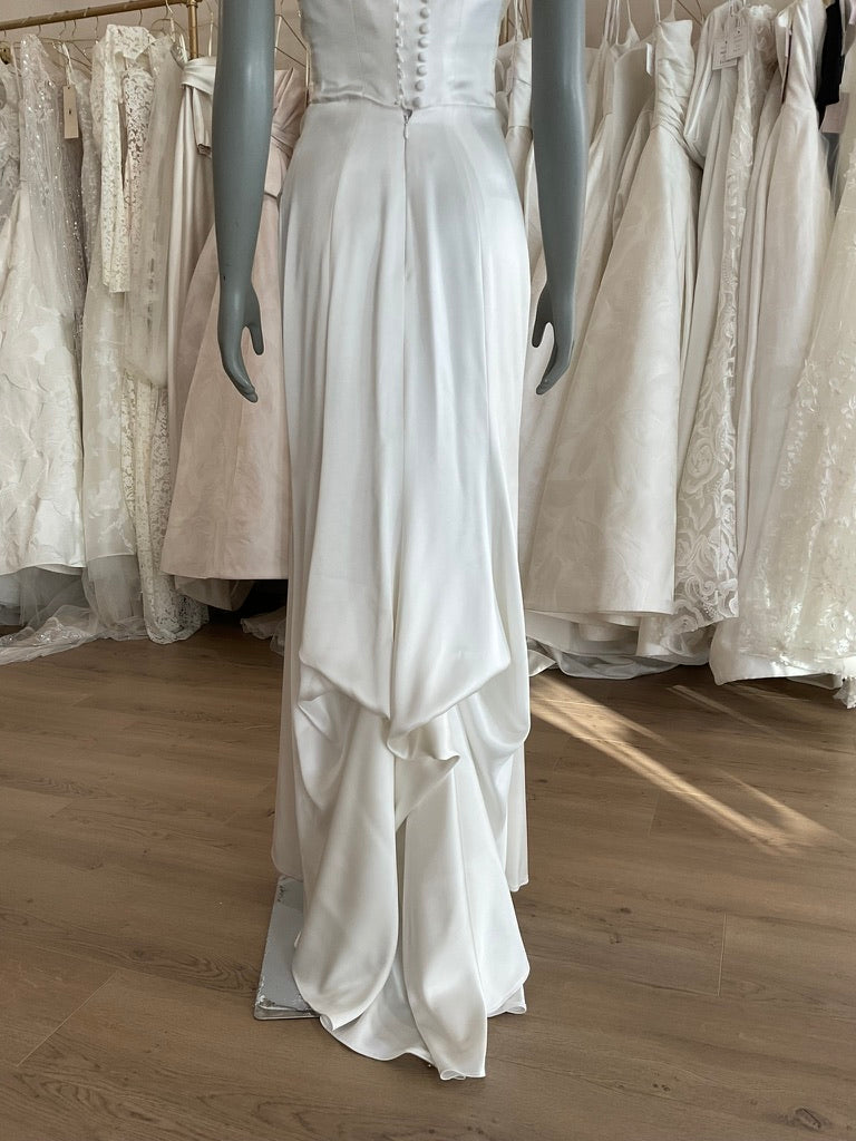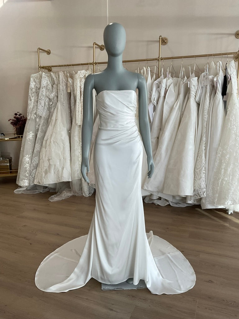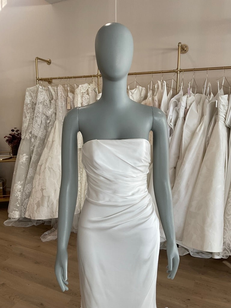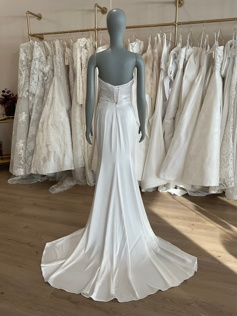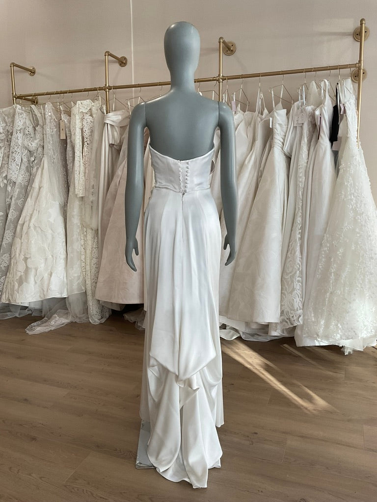 The Lihi Hod Chloe gown is the epitome of chic minimalism for the modern bride. Crafted from luxe silk satin, this strapless gown features a structured bodice with expertly draped ruching across the waist that flatters and enhances the figure. The sleek silhouette hugs through the hips and gently flares into a soft, flowing train for effortless elegance. The back is finished with a row of delicate covered buttons and a clean, dipped scoop that adds a subtle touch of romance. Perfect for the bride seeking timeless sophistication with a modern edge.