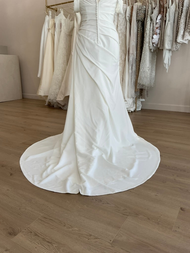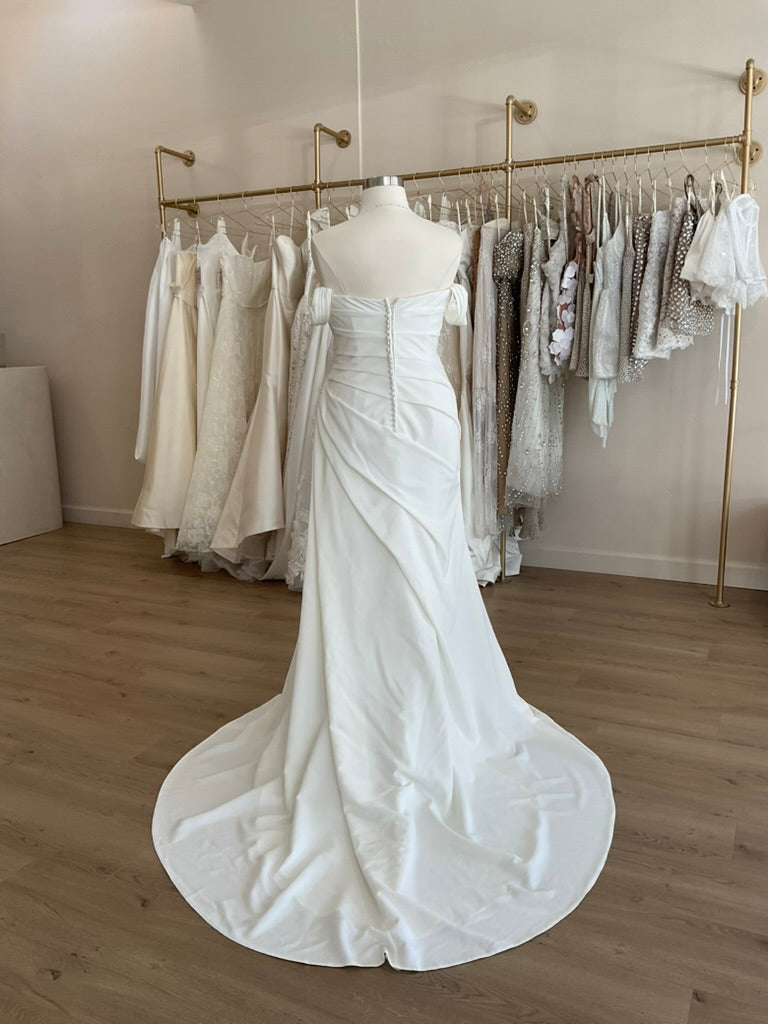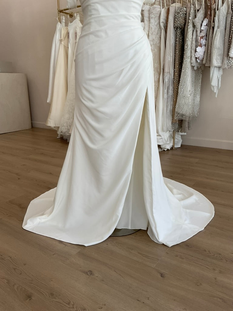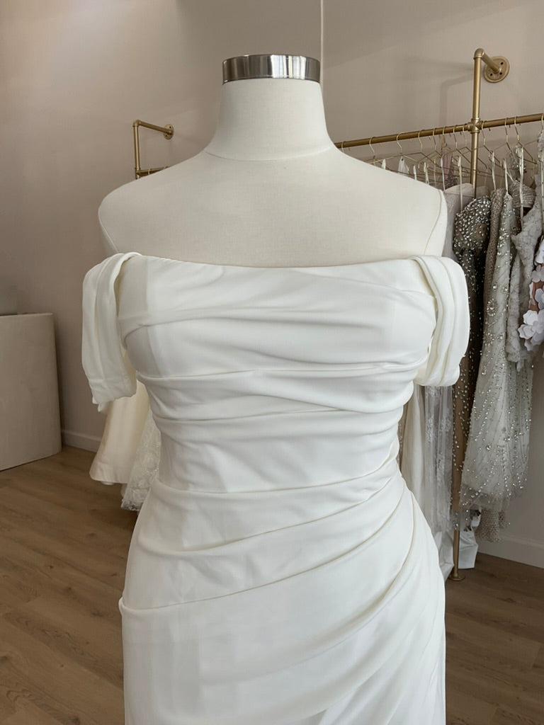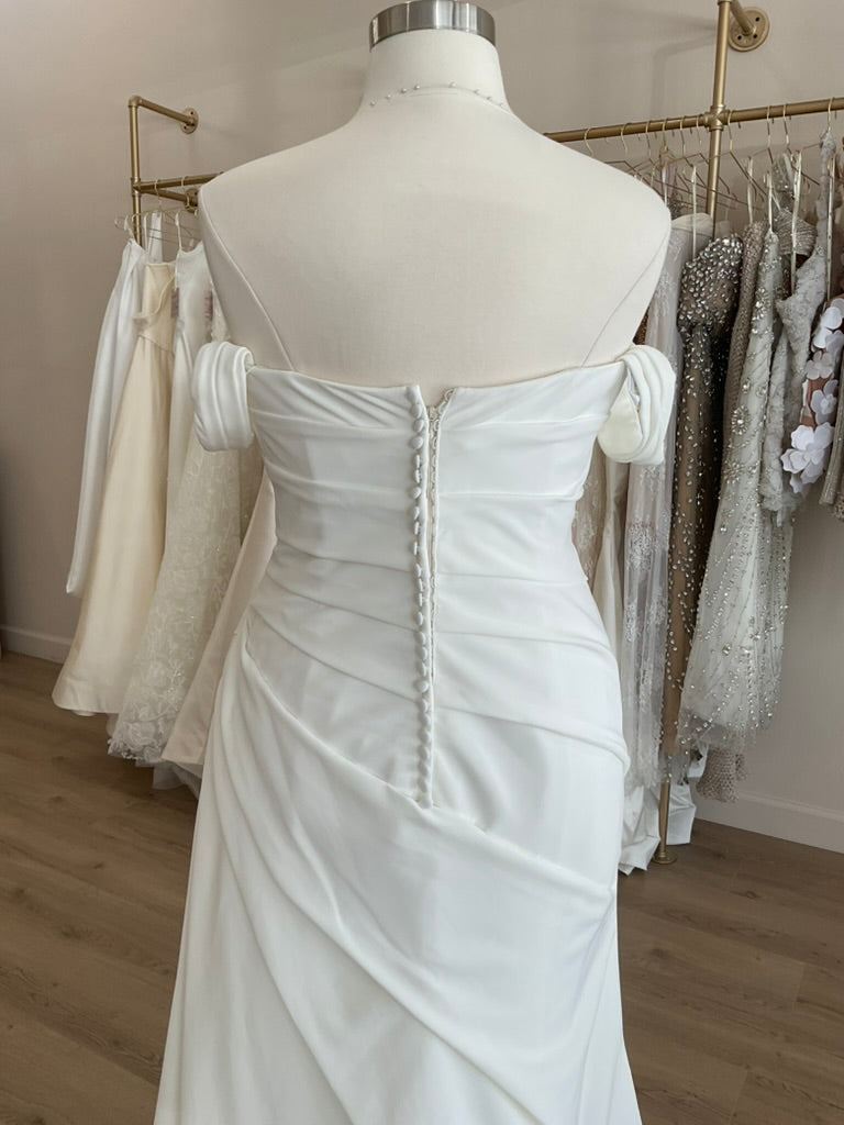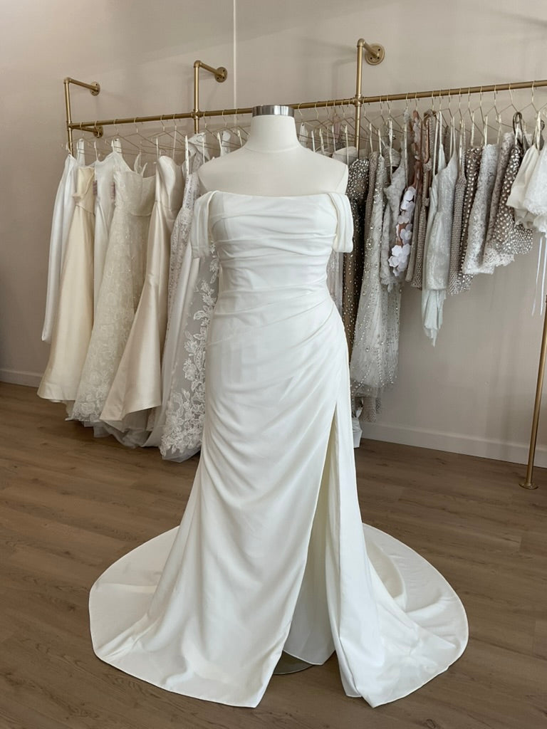 The Louvienne Sterling gown is a stunning choice for the bride who wants sleek sophistication with a touch of modern glamour. Crafted from crepe, this off-the-shoulder sheath features elegant draping across the bodice, highlighting the natural waist and décolletage. The sultry thigh-high slit adds a bold, fashion-forward edge while allowing for effortless movement. The back is finished with a row of covered buttons that cascade into a soft chapel-length train, bringing classic bridal romance to this contemporary silhouette. Perfect for the bride who adores clean lines and understated drama.