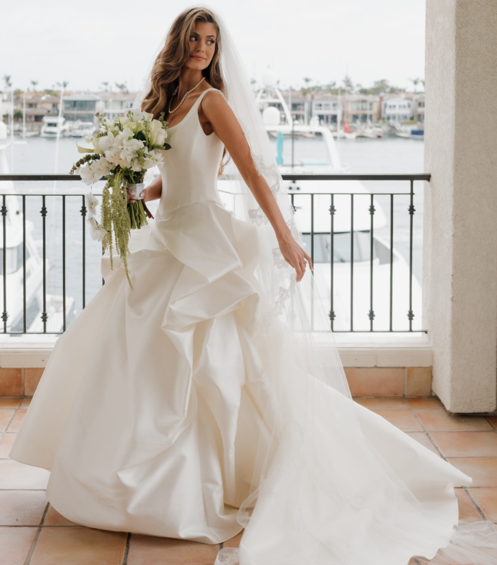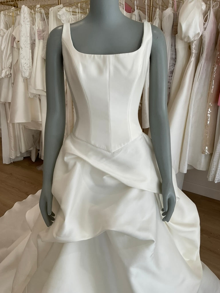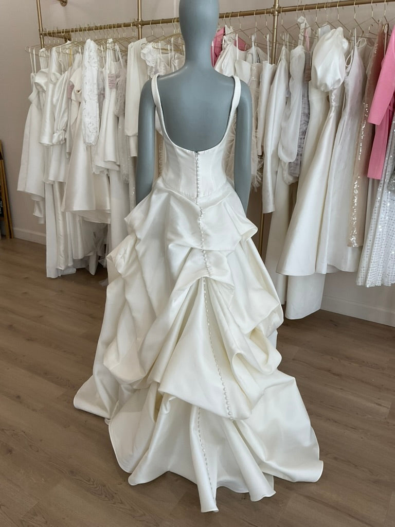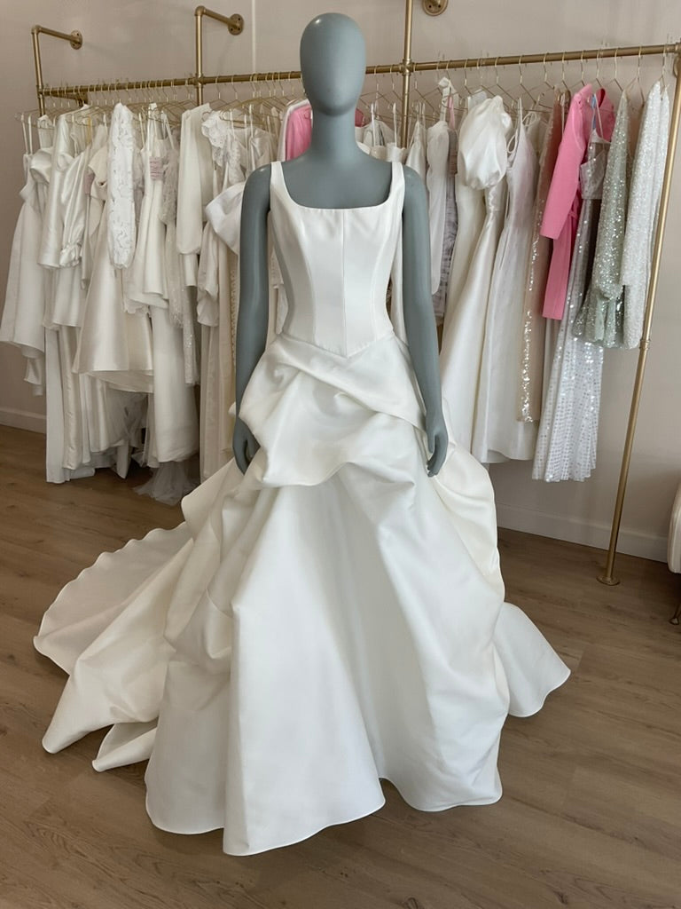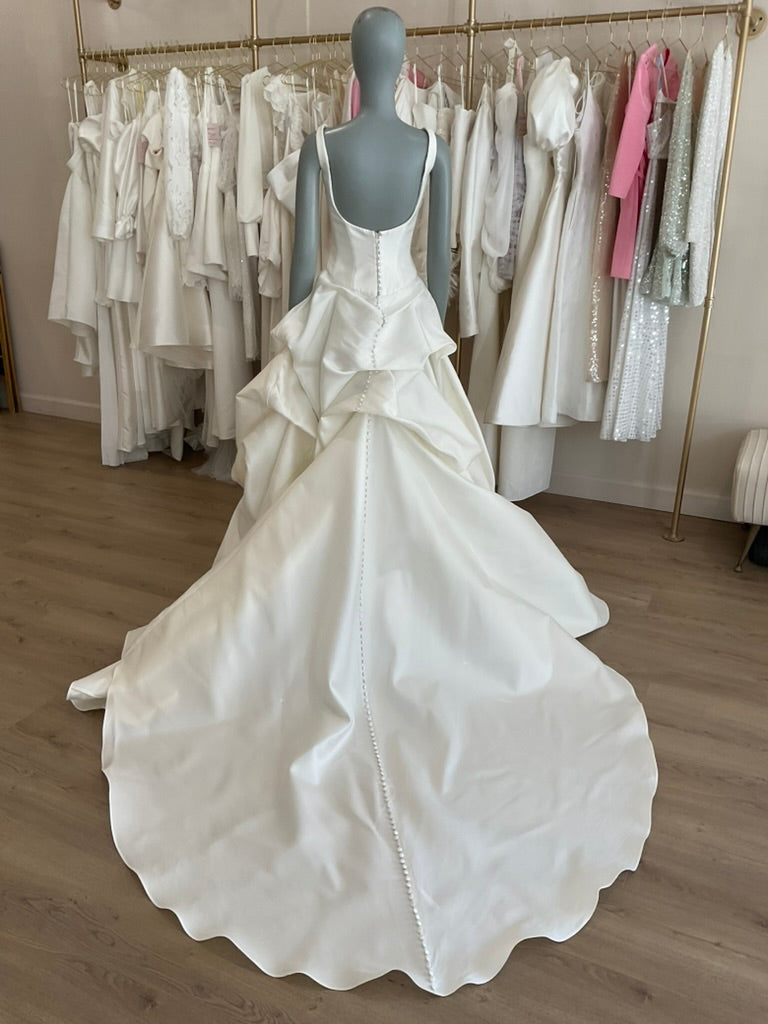 The Mark Ingram Katt is a bold and structured ballgown for the modern bride who wants to make an unforgettable entrance. The clean, square neckline and sleek bodice offer a refined elegance, balanced by a sculptural voluminous skirt with dramatic duchess satin folds. The gown features a low scoop back that meets a trail of covered buttons, adding a romantic touch to its architectural design. The sharply tailored silhouette is perfect for the bride seeking a fashion-forward look that still feels timeless and regal. Ideal for grand ceremonies or black-tie celebrations.