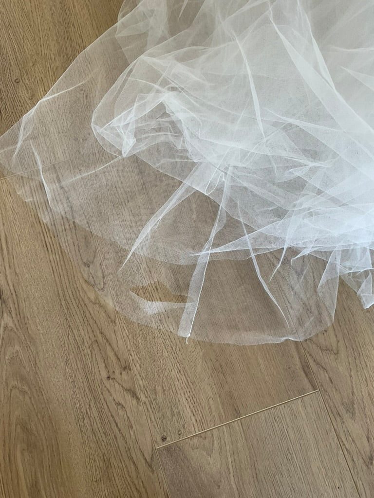 Flaws: There are some tears in the bottom layers of tulle and a seam in the top layer should be reclosed.