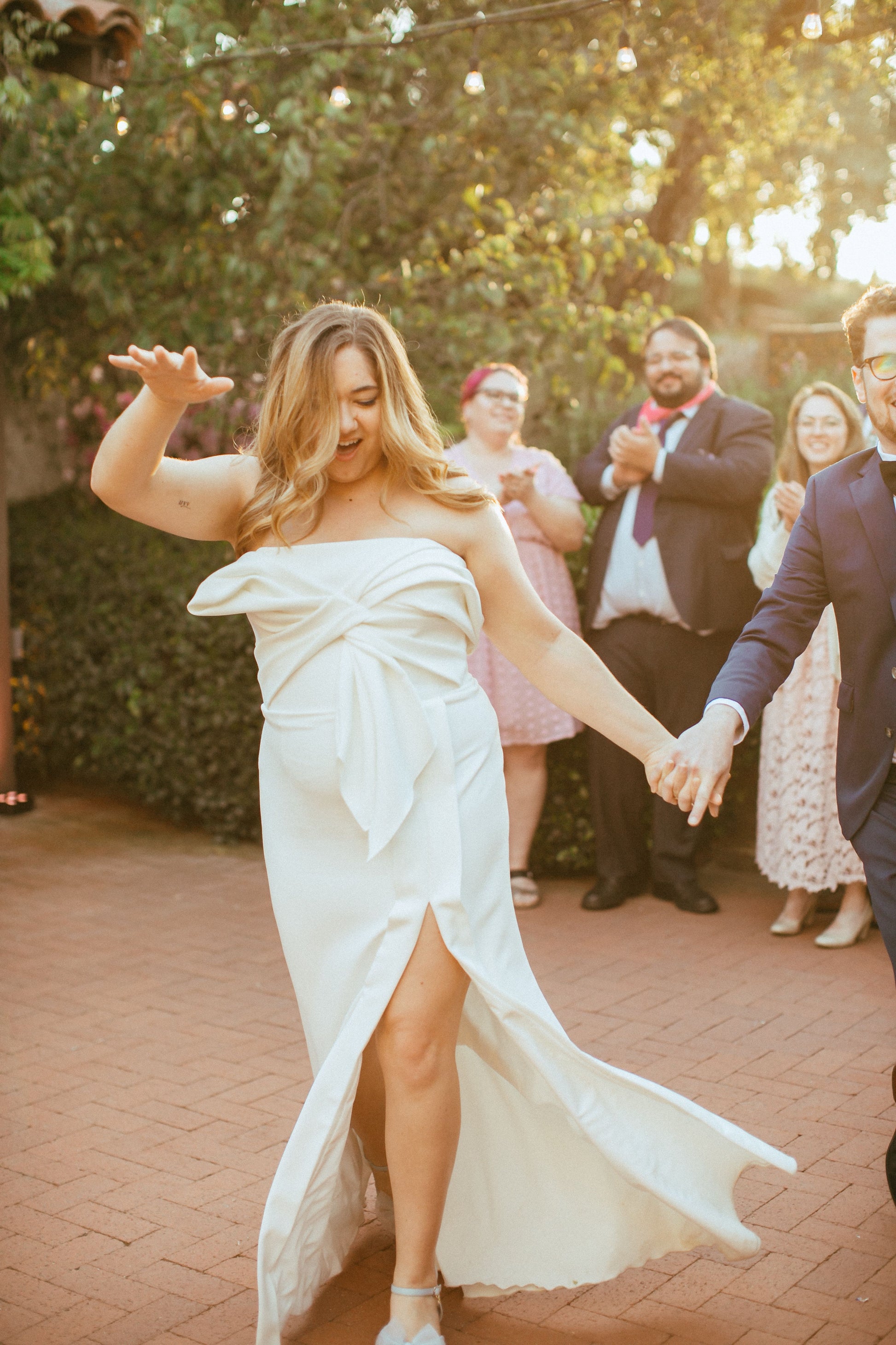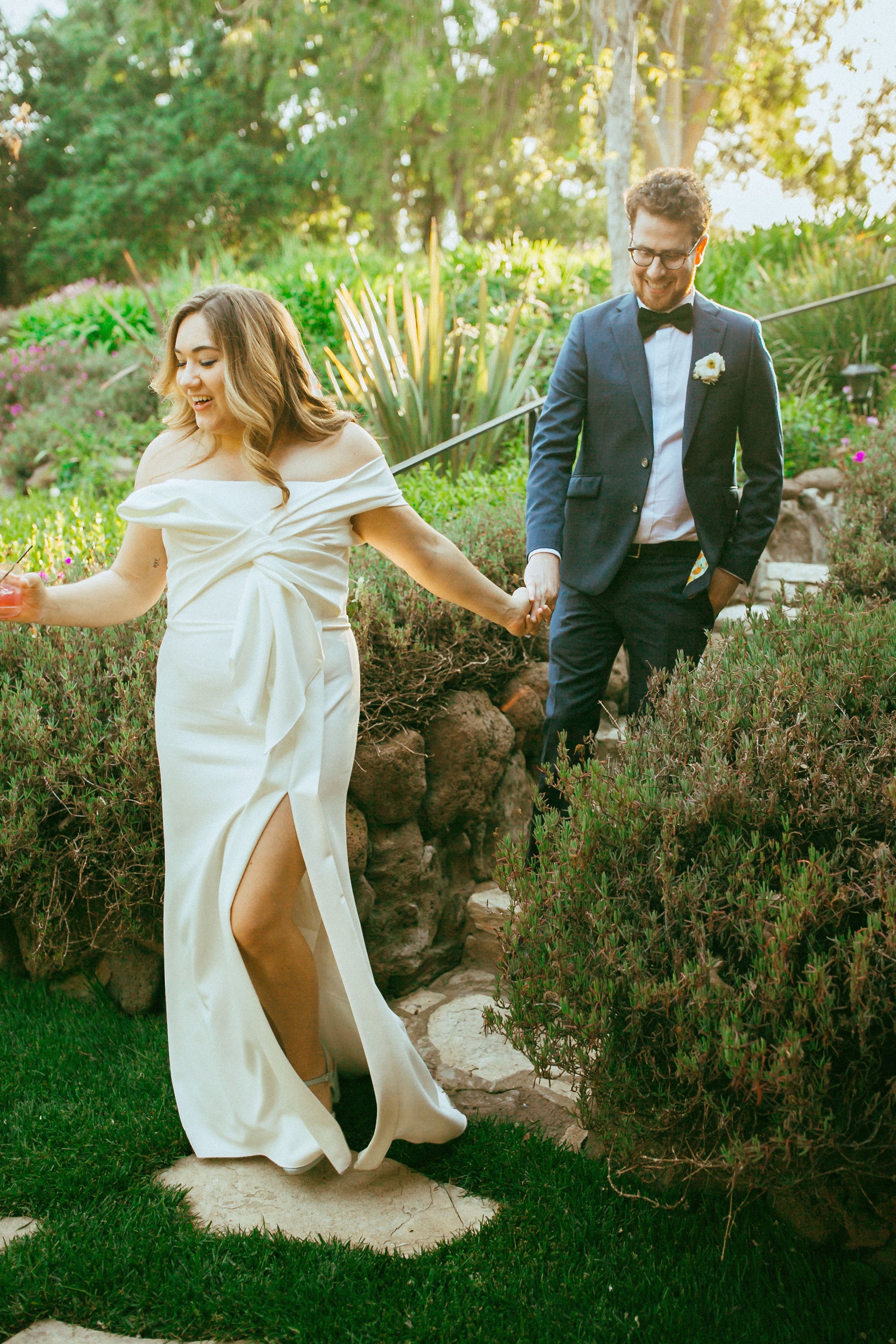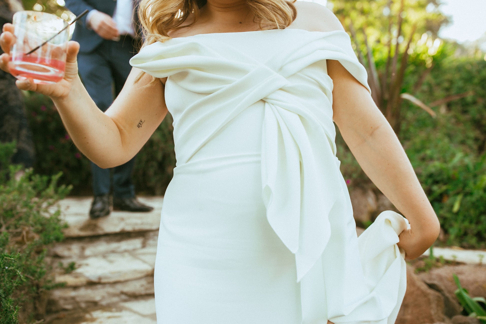 The NEWHITE IBT dress is a bold, modern statement for the effortlessly chic bride. Crafted in fluid satin crepe, this minimalist gown is reimagined with structural artistry—its standout feature is the oversized bow detail that wraps the bodice and cascades elegantly down the skirt. The off-the-shoulder neckline frames the collarbones while keeping the silhouette clean and contemporary. A sleek column fit flatters the body while the high-low hem adds playful movement and a hint of dramatic flair. Perfect for the fashion-forward bride seeking an unconventional yet sophisticated look.