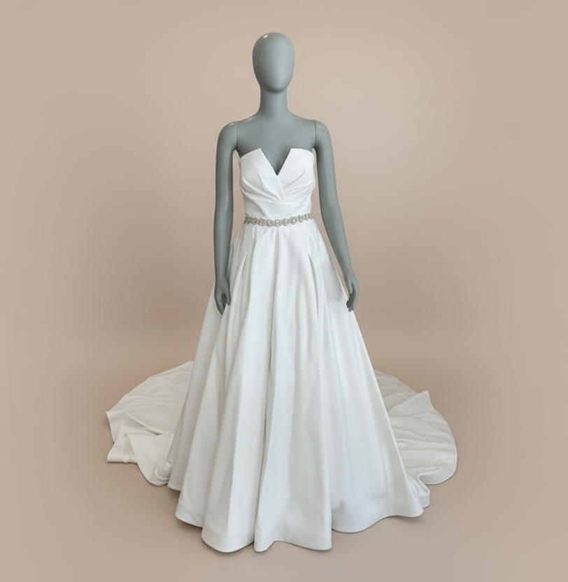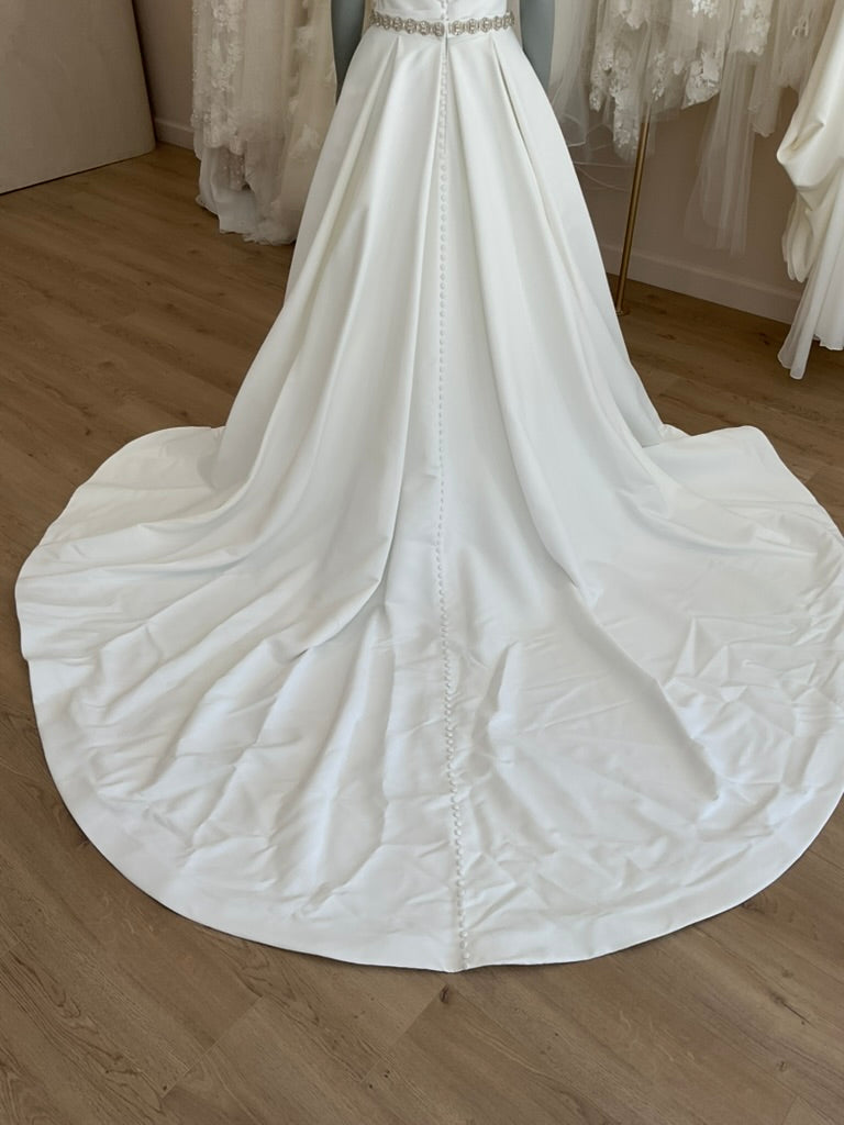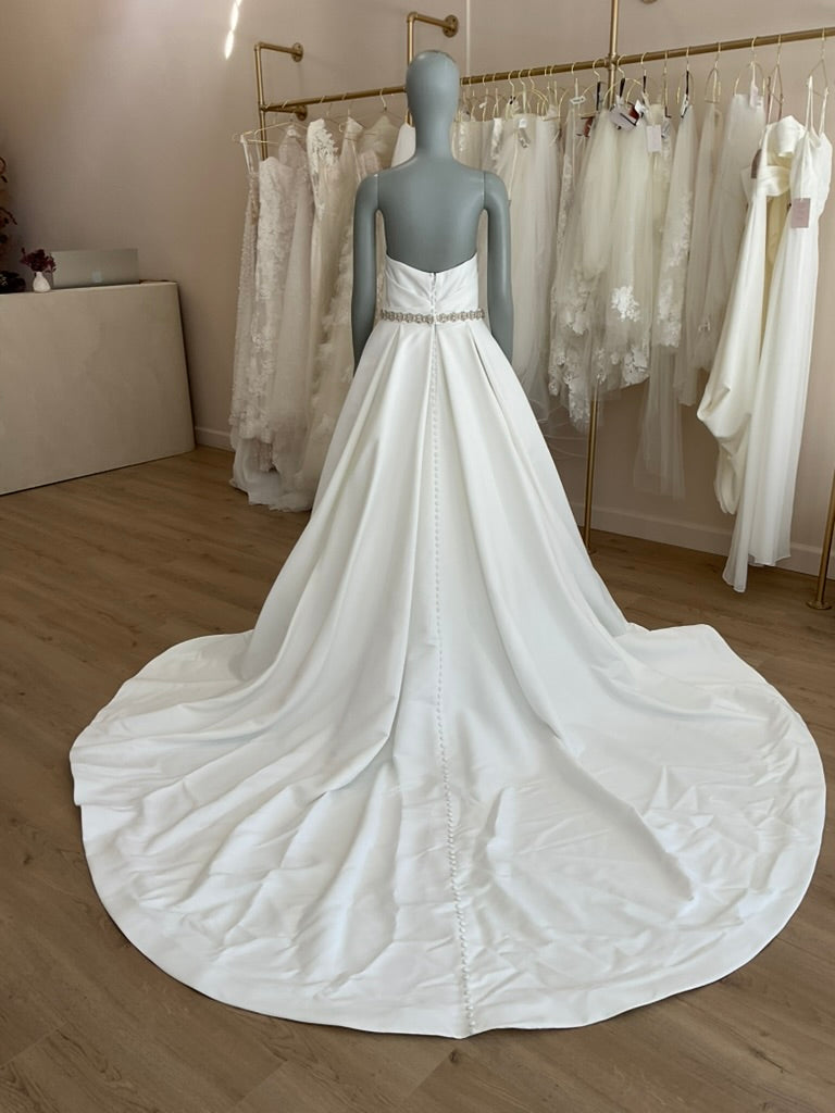 The Rita Vinieris Alyne Camila gown is a modern minimalist dream with timeless elegance. This strapless A-line silhouette features a sculpted notched neckline and a clean, structured bodice that enhances the natural waistline. Made from luxurious silk satin, the full skirt flows effortlessly to the floor, creating soft movement and volume without bulk. The back boasts a classic row of covered buttons leading into a sweeping chapel-length train, combining sophistication with effortless romance. Perfect for the bride who loves refined simplicity with a touch of architectural drama.