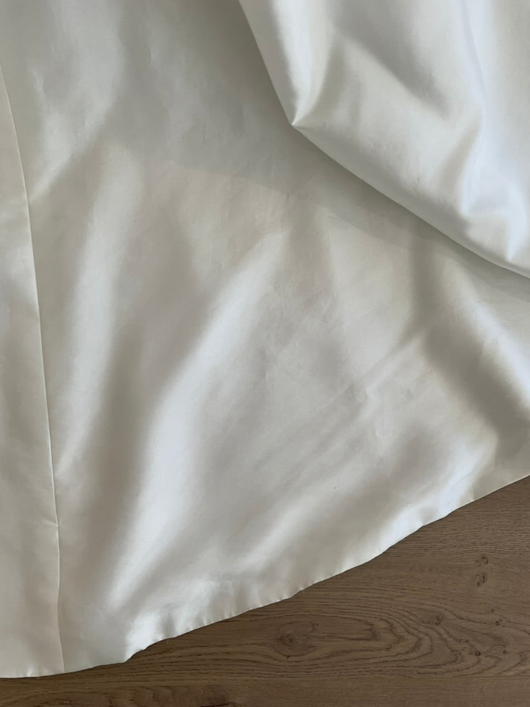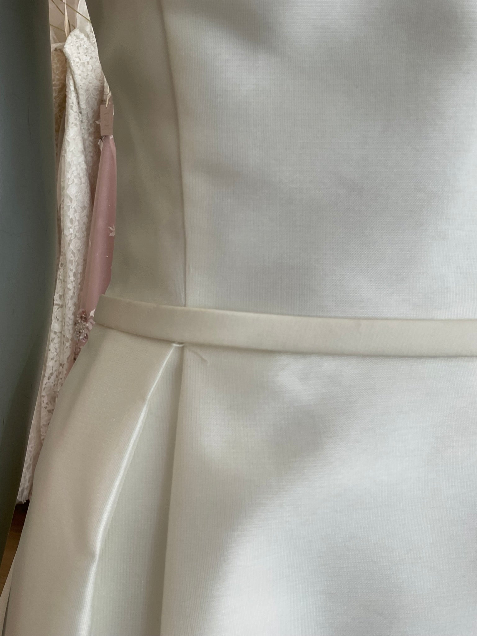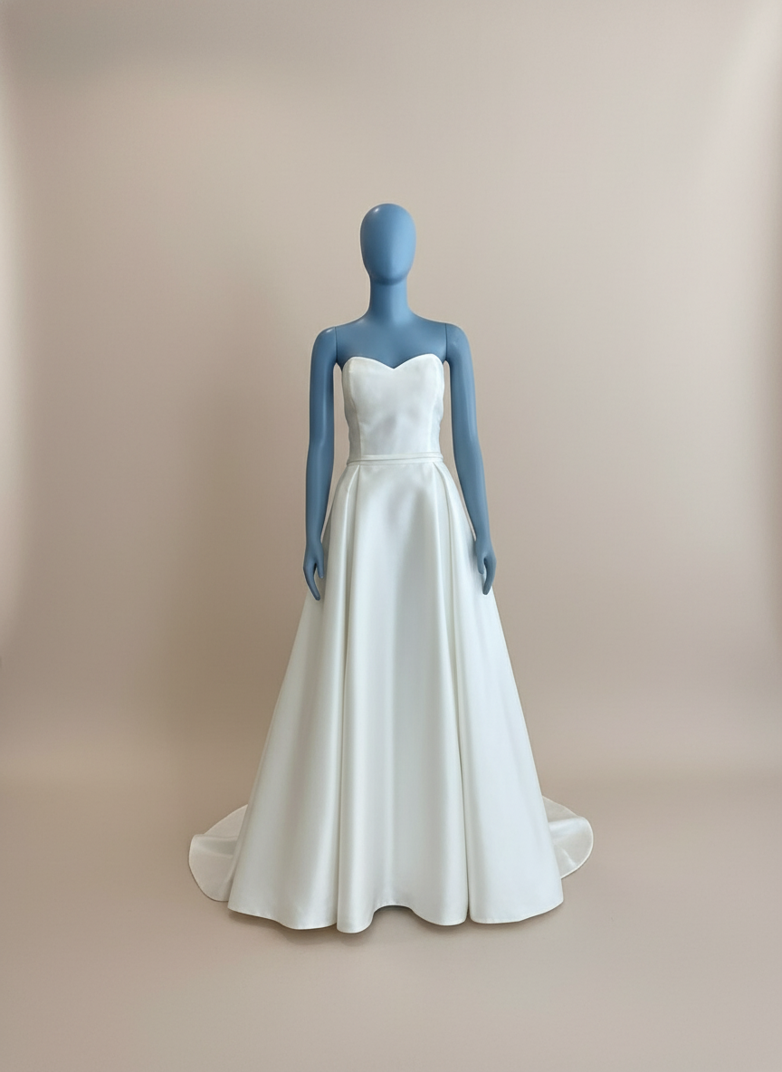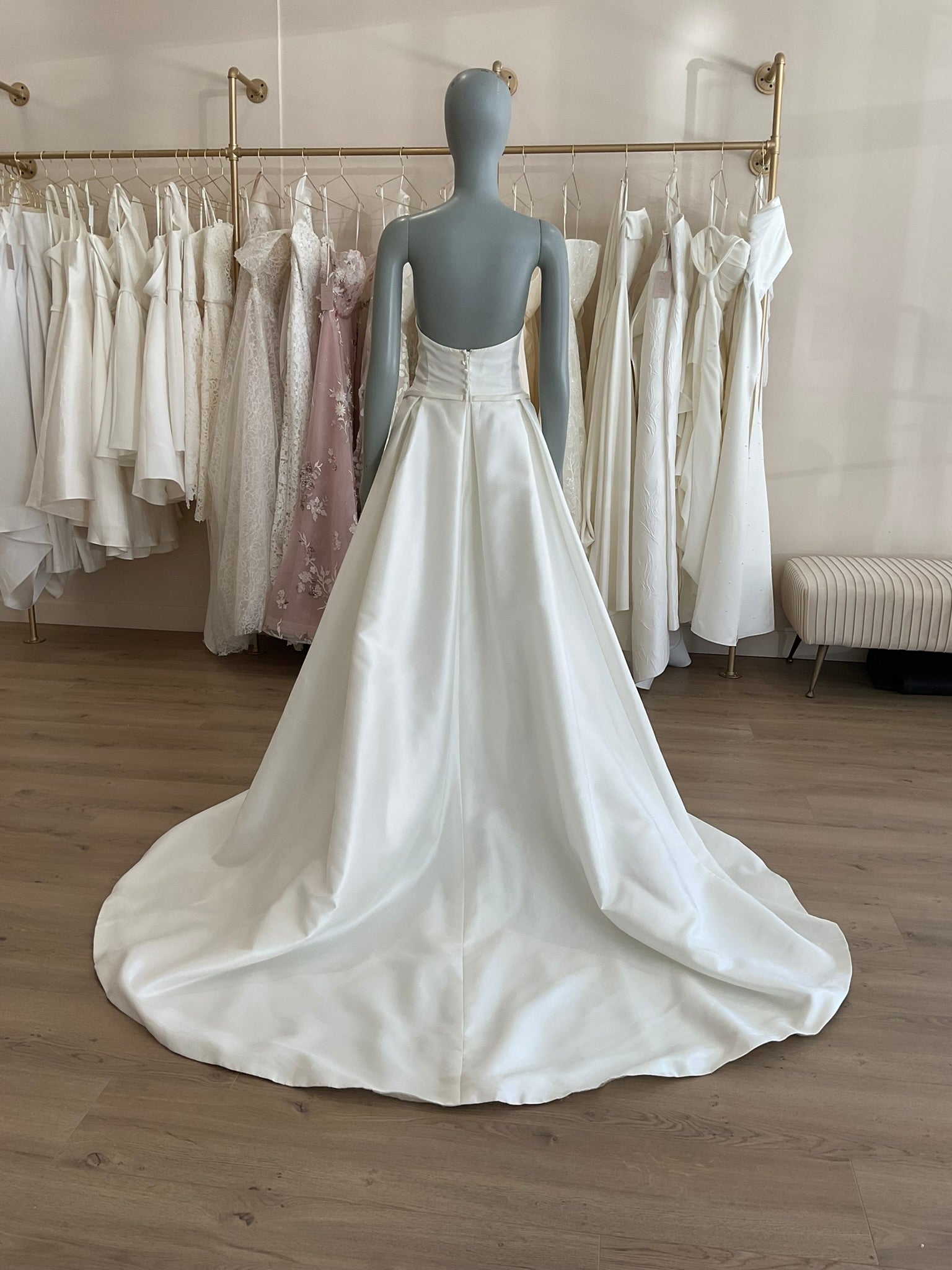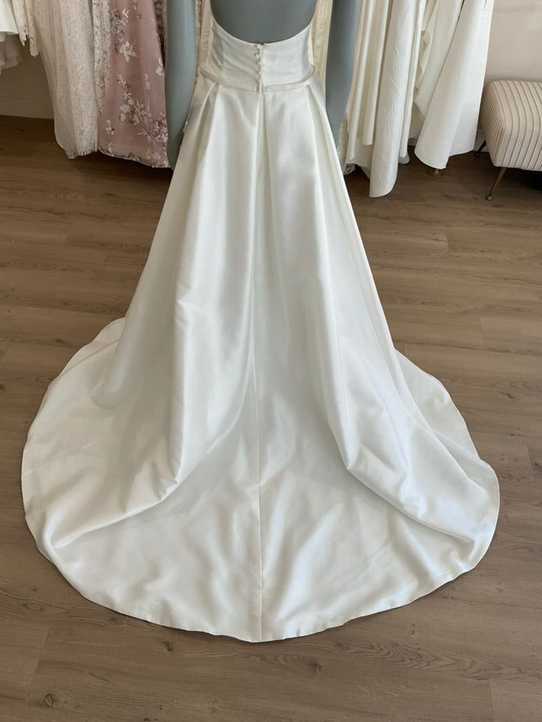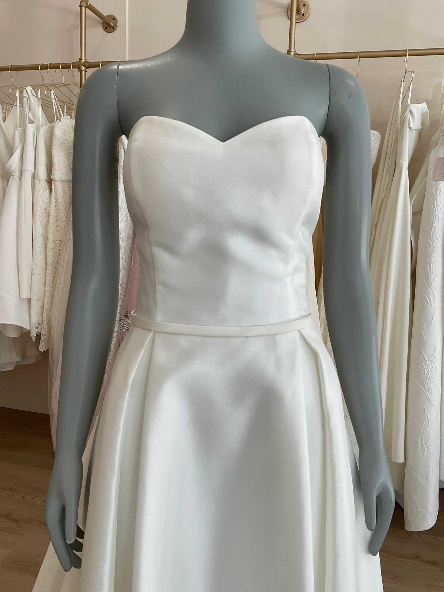 The Heather gown by Robert Bullock is a clean and simple aline perfect for the timeless bride. The subtle sweetheart neckline is a perfect complement to any accessories you have in mind. The natural waistline has side box pleats for just a bit of volume and movement. The gown has a moderate train.