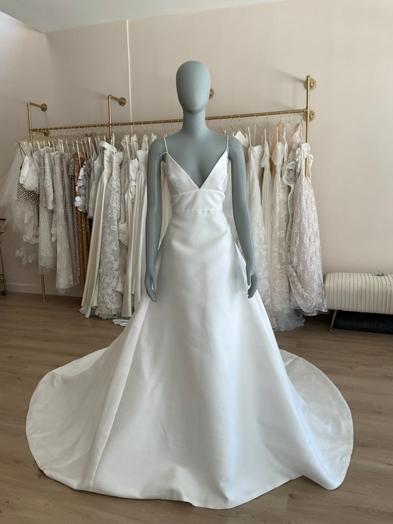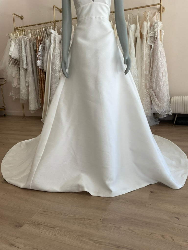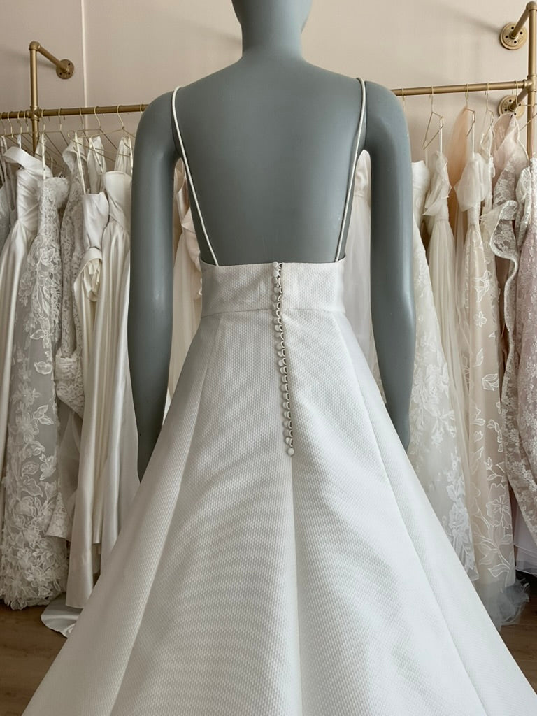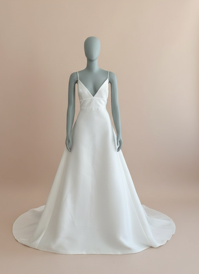 The Rosa Clara Maya is the perfect gown for the modern minimalist bride craving timeless elegance. This stunning A-line silhouette features a deep V neckline with delicate spaghetti straps, offering a soft yet structured bodice that flatters the décolletage beautifully. Crafted from luxurious textured fabric, the clean lines and impeccable tailoring elevate its simplicity to high sophistication. The open low back is adorned with a row of dainty buttons for a romantic touch, leading effortlessly into a full, flowing skirt with a dramatic chapel-length train. Understated yet striking, the Maya gown is a breath of fresh air — ideal for a chic city celebration or a grand estate affair.