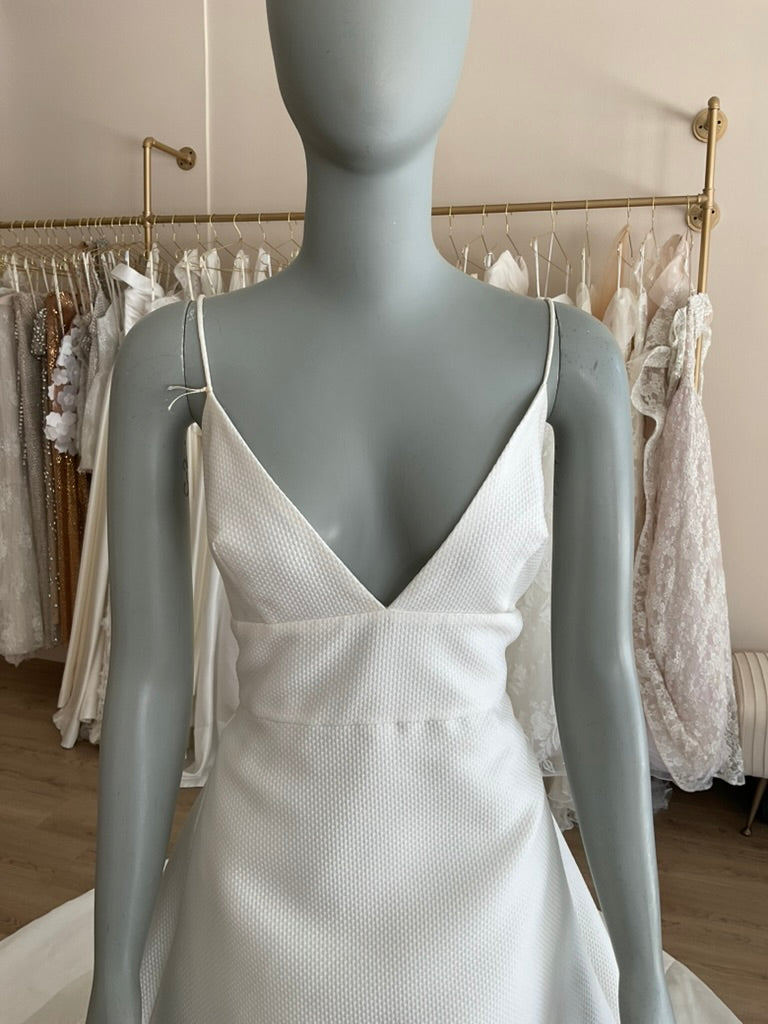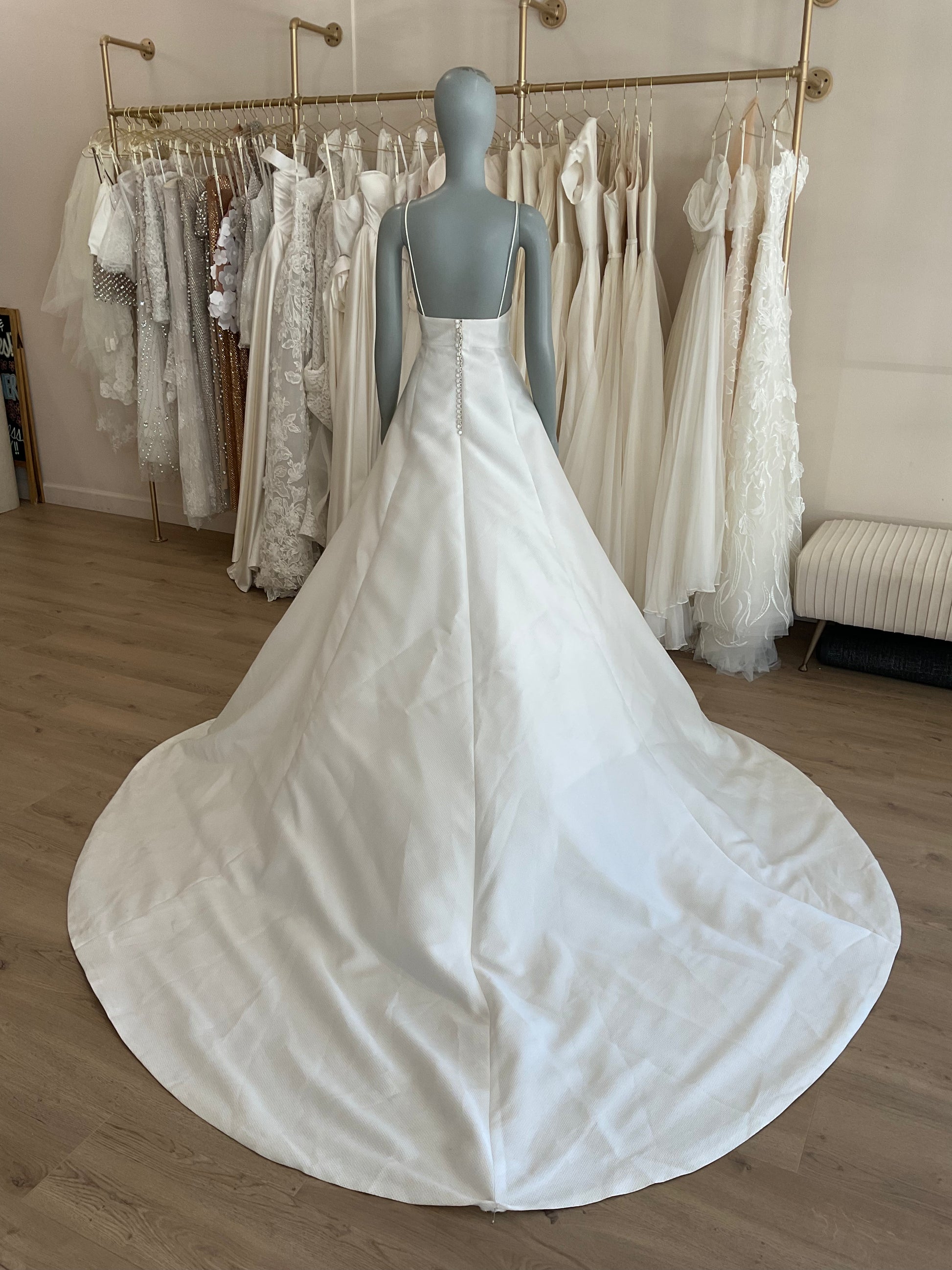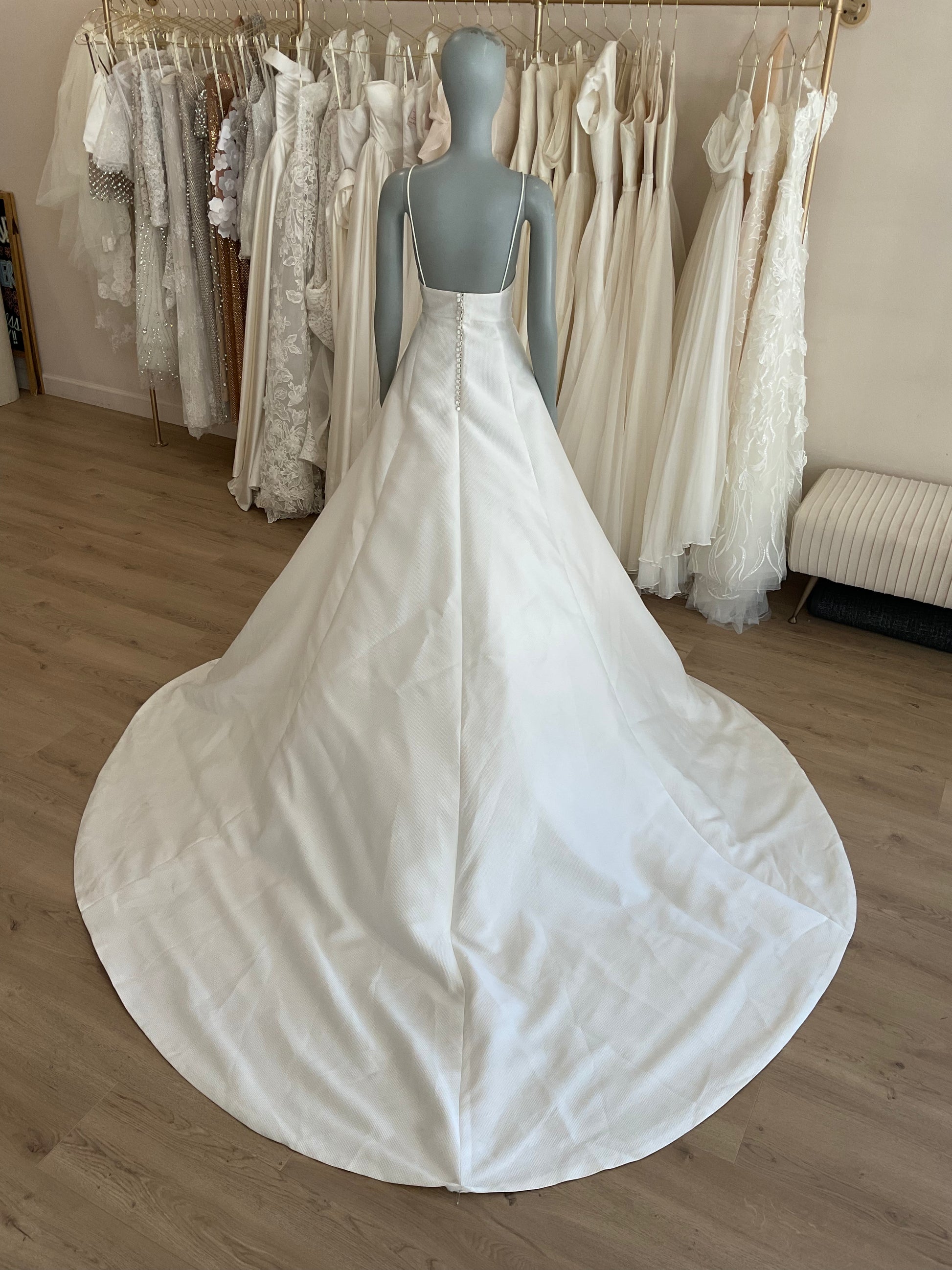 The Rosa Clara Maya is the perfect gown for the modern minimalist bride craving timeless elegance. This stunning A-line silhouette features a deep V neckline with delicate spaghetti straps, offering a soft yet structured bodice that flatters the décolletage beautifully. Crafted from luxurious textured fabric, the clean lines and impeccable tailoring elevate its simplicity to high sophistication. The open low back is adorned with a row of dainty buttons for a romantic touch, leading effortlessly into a full, flowing skirt with a dramatic chapel-length train. Understated yet striking, the Maya gown is a breath of fresh air — ideal for a chic city celebration or a grand estate affair.