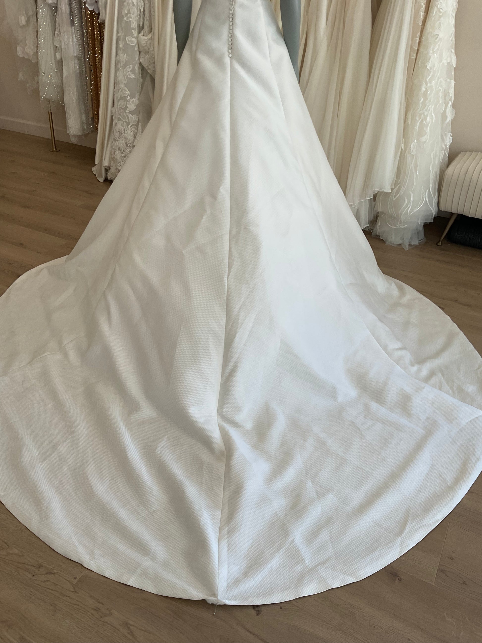 NOT LOCAL TO LA-Schedule a free 30 minute virtual fitting appointment before it's too late. Our inventory of hard to find wedding dresses is limited, and this is the only dress in stock and is available on a first come, first-served basis. Click here for a virtual Appointment