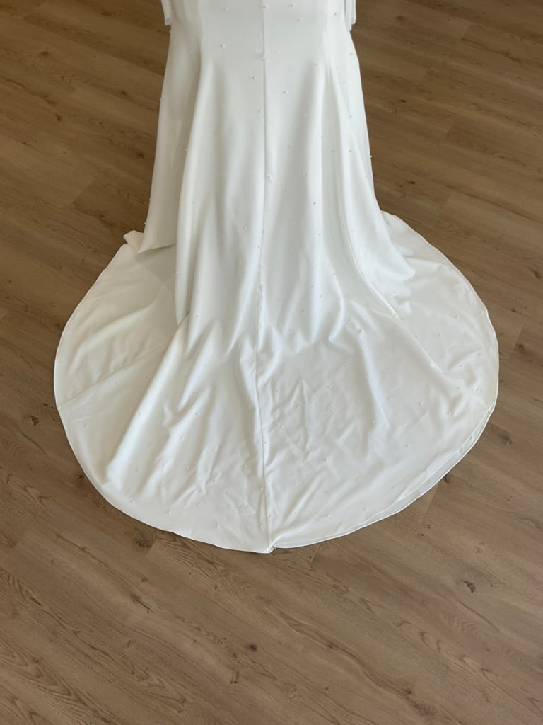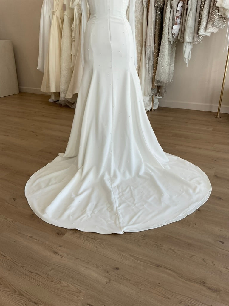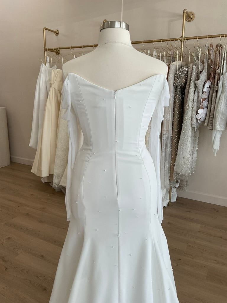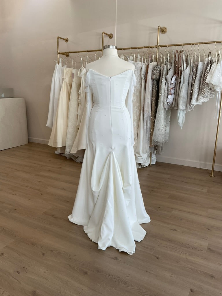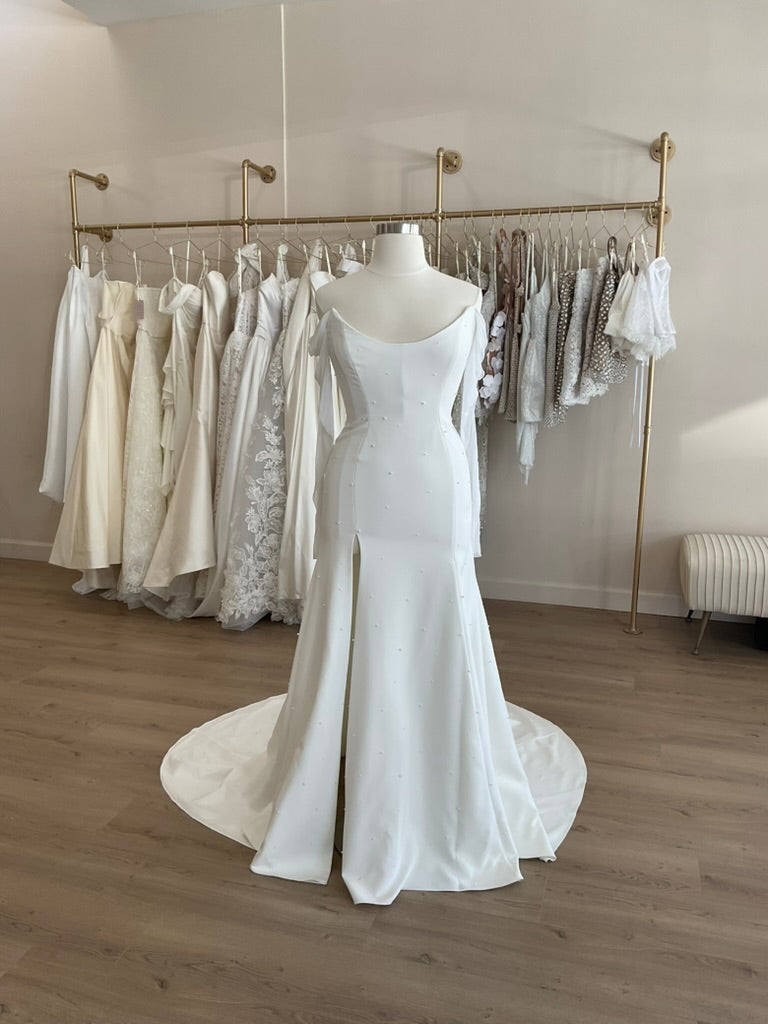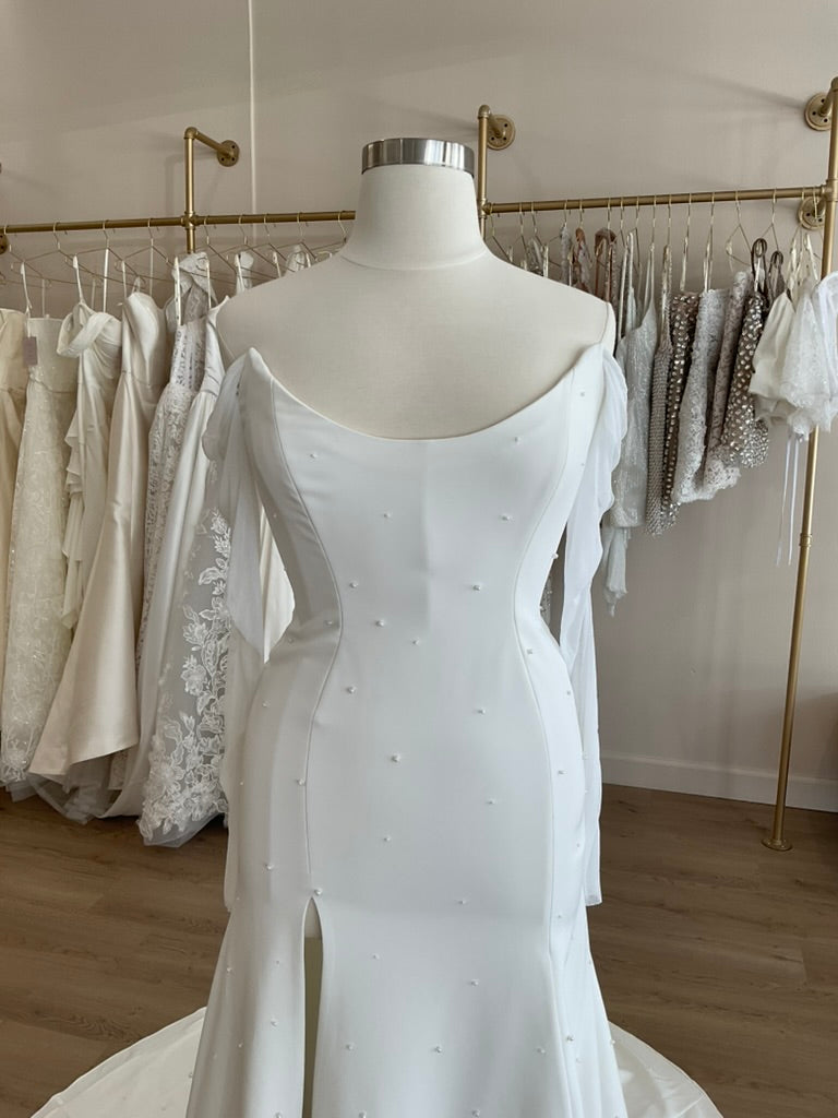 The Sarah Seven Brontë gown is a stunning blend of modern elegance and timeless romance. Designed for the contemporary bride with a flair for fashion, this off-the-shoulder silhouette features a softly curved neckline and sheer long sleeves with delicate ruching for a dreamy, ethereal effect. Subtle pearl-like embellishments are scattered gracefully across the sleek crepe fabric, adding just the right amount of shimmer. A sultry thigh-high slit brings a modern edge, while the slim fit and gentle flare of the skirt flatter the figure effortlessly. Perfect for the bride who wants to turn heads with sophistication and confidence.