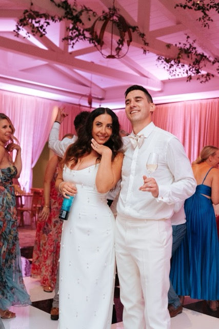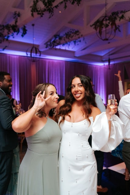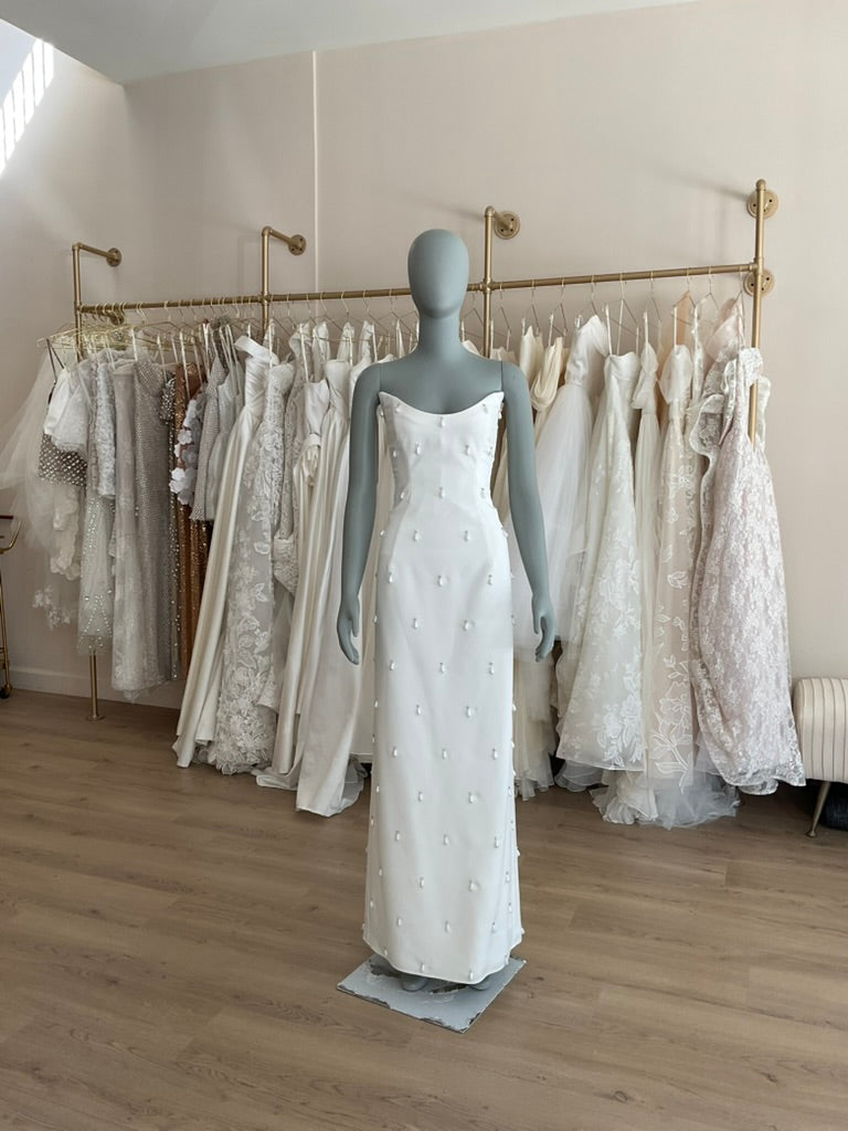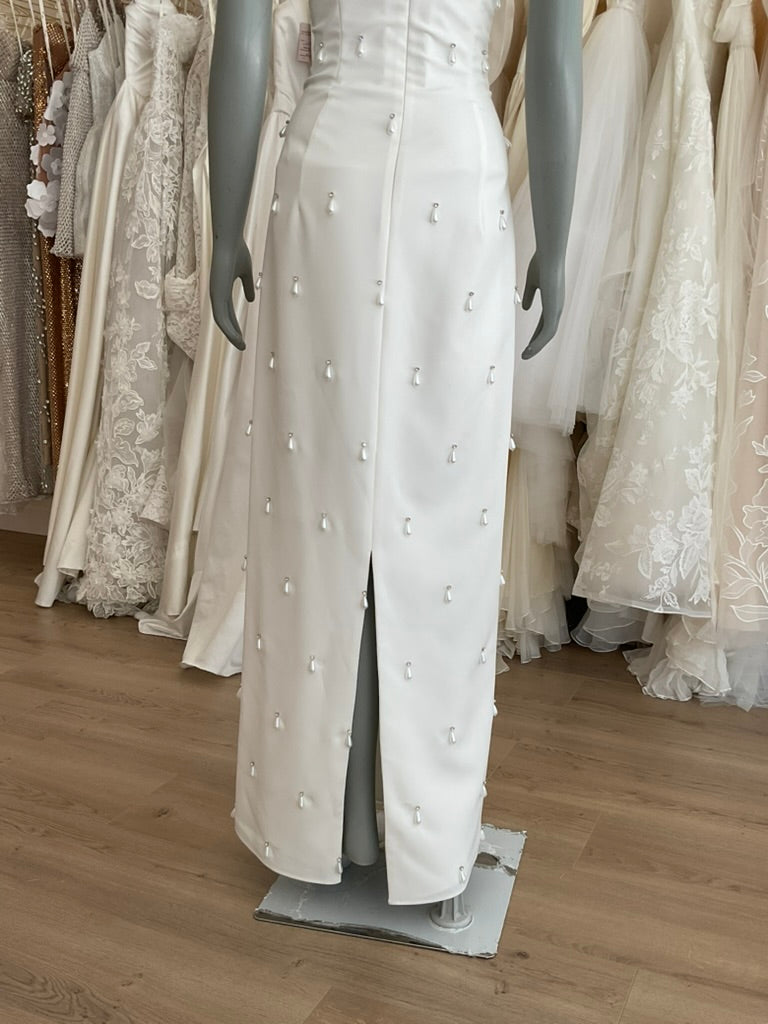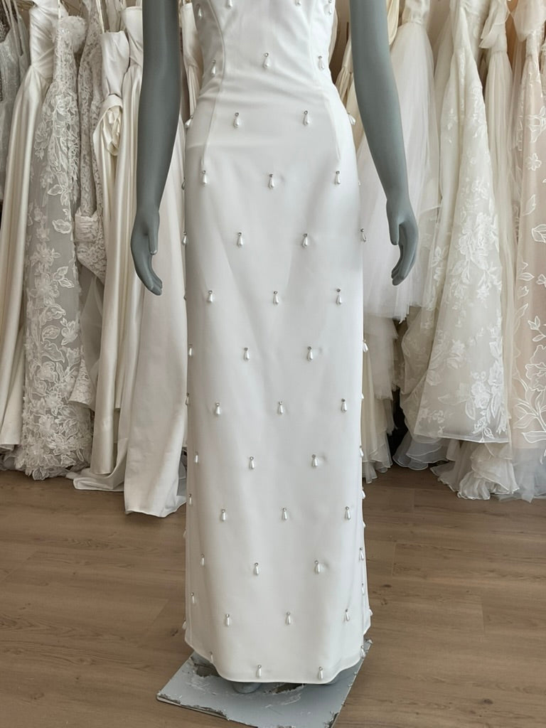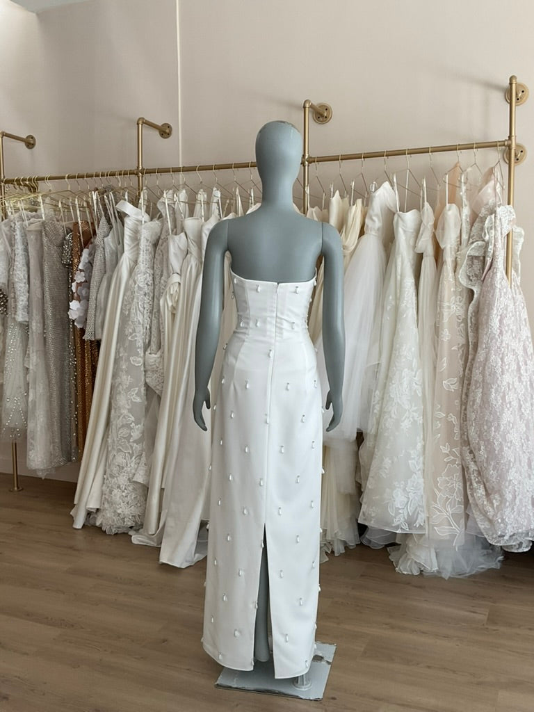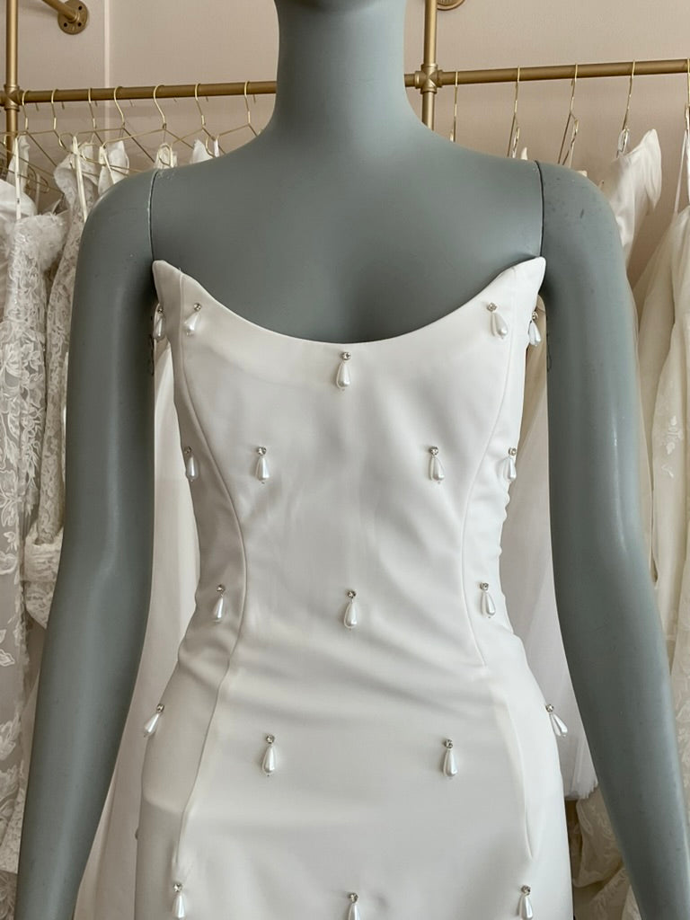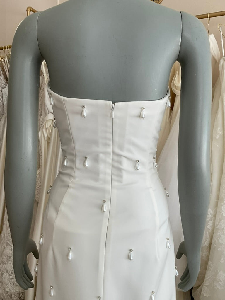 Boldly modern with a nod to vintage glam, the Sarah Seven Candy gown is the ultimate mix of sweet and sultry. This chic strapless sheath silhouette is cut from a sleek ivory crepe that hugs the body like a dream. The curved neckline adds a soft, romantic shape while delicate pearl and sequin embellishments are scattered throughout the gown, giving it a subtle sparkle and playful texture. Perfect for the bride who wants elegance with an edge, Candy makes a statement without saying a word. Its clean lines, body-skimming fit, and crisp tailoring create a striking silhouette, while its beaded accents offer just the right amount of bridal shine. Ideal for an upscale city wedding, fashion-forward affair, or a glam reception look.