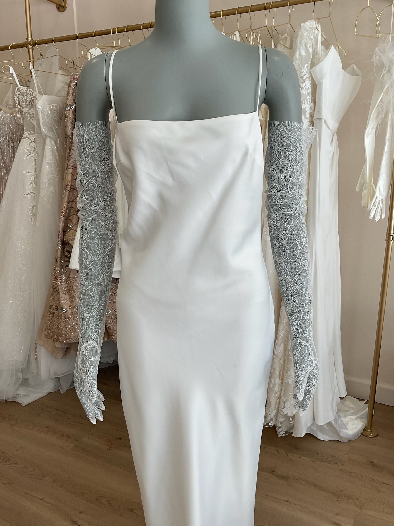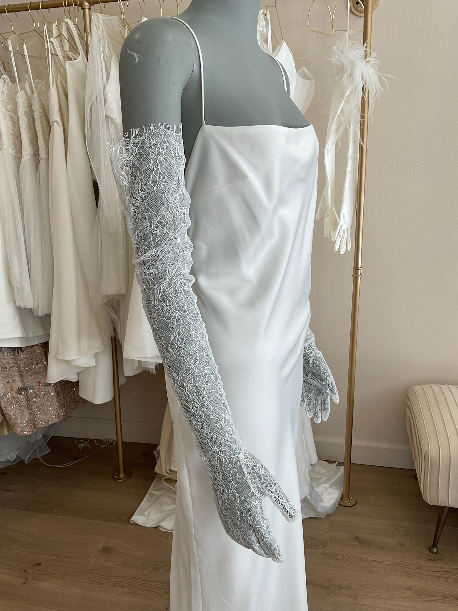 The fingered Sarah Seven Lace Bridal gloves is soft delicate accessory option for the trendy bride. The lace sleeves end above the elbow.
