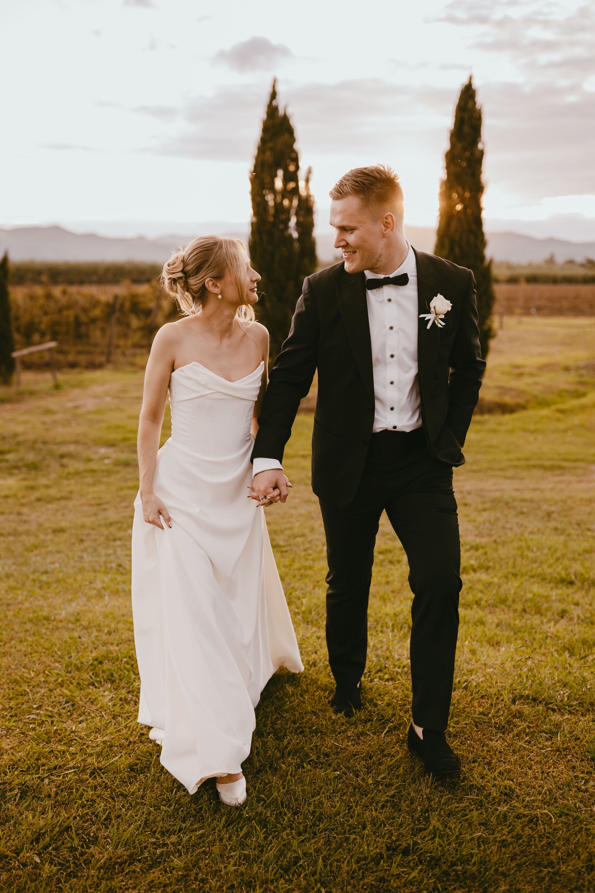 The Sarah Seven The Whisper gown is the epitome of minimalist elegance. Crafted for the modern romantic, this strapless A-line silhouette features a softly draped bodice with flattering asymmetrical pleating that enhances the natural waist. The cat eye neckline offers a timeless femininity, while the clean, structured lines of the skirt bring a sleek sophistication. Made in a luxe matte fabric, this gown exudes understated glamour from ceremony to last dance. Finished with a flowing chapel-length train, The Whisper is perfect for the bride who wants to make a bold statement with effortless grace.