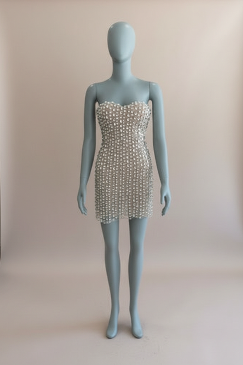 The Sky Mor Bridal Olivia is a dazzling mini dress made for the bride who wants to sparkle and shine. This strapless stunner features a structured, sheer nude base adorned with a grid of sparkling sequins and mirrored embellishments from top to hem. The sweetheart neckline adds a romantic touch, while the body-hugging silhouette highlights your curves in all the right ways. The open low back brings a sultry edge, balanced by a playful, leg-baring skirt. Perfect for a reception outfit change, bachelorette party, or glam bridal event, the Olivia is a showstopping pick for the bride who’s ready to light up the night.