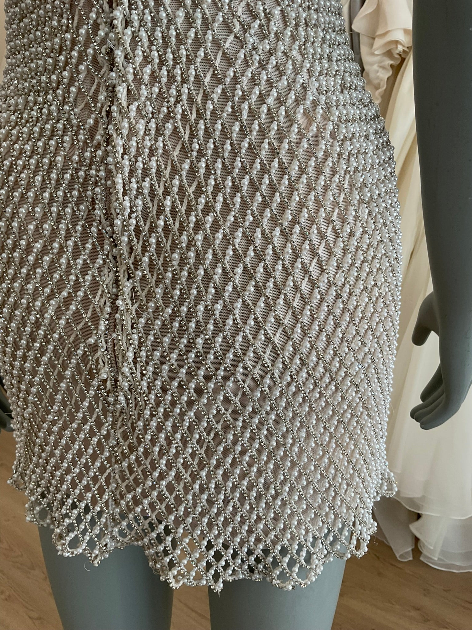 The Sky Mor Bridal Paris is the definition of modern sparkle with a fashion-forward edge. Designed for the bride who dares to dazzle, this fully hand-beaded mini dress is a show-stopping choice for your reception, after-party, or bridal getaway look. The figure-hugging silhouette is crafted with intricate lattice-style beading that adds dimensional texture and shimmer with every movement. A deep V neckline and delicate spaghetti straps flatter the décolletage, while the low open back adds an element of sultry sophistication. Finished with a subtle scalloped hemline, this mini is the ultimate blend of glam and chic.