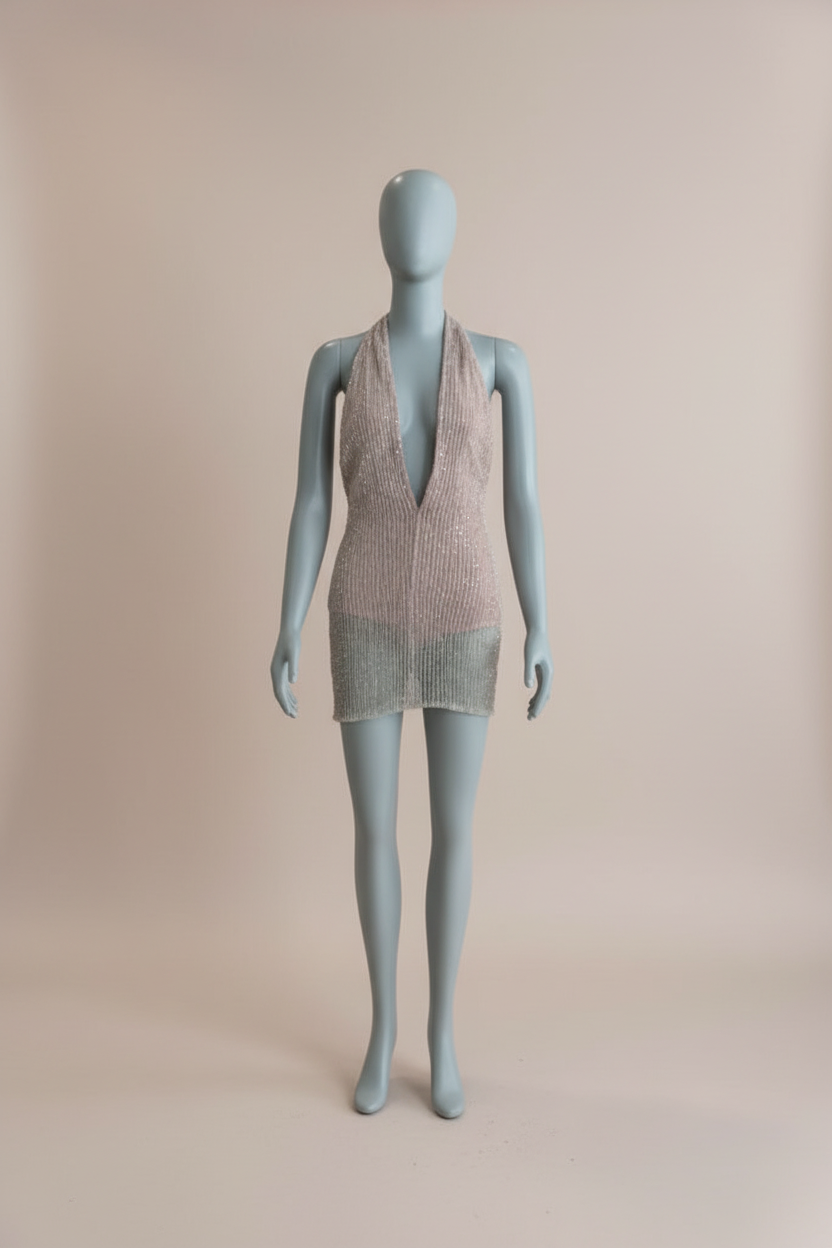 For the daring bride or party-ready newlywed, the Sky Mor Bridal Rae is the ultimate statement mini. This sleek halter gown features a plunging neckline and open back that exude modern glamour. A nude mesh base is layered with shimmering silver beadwork in vertical lines that elongate the figure and catch the light with every move. The fit is ultra-body-conscious, showcasing your curves in a chic and confident silhouette. The Rae is perfect for your reception, after-party, or bachelorette celebration—a bold, sparkling choice for the bride who’s anything but traditional.
