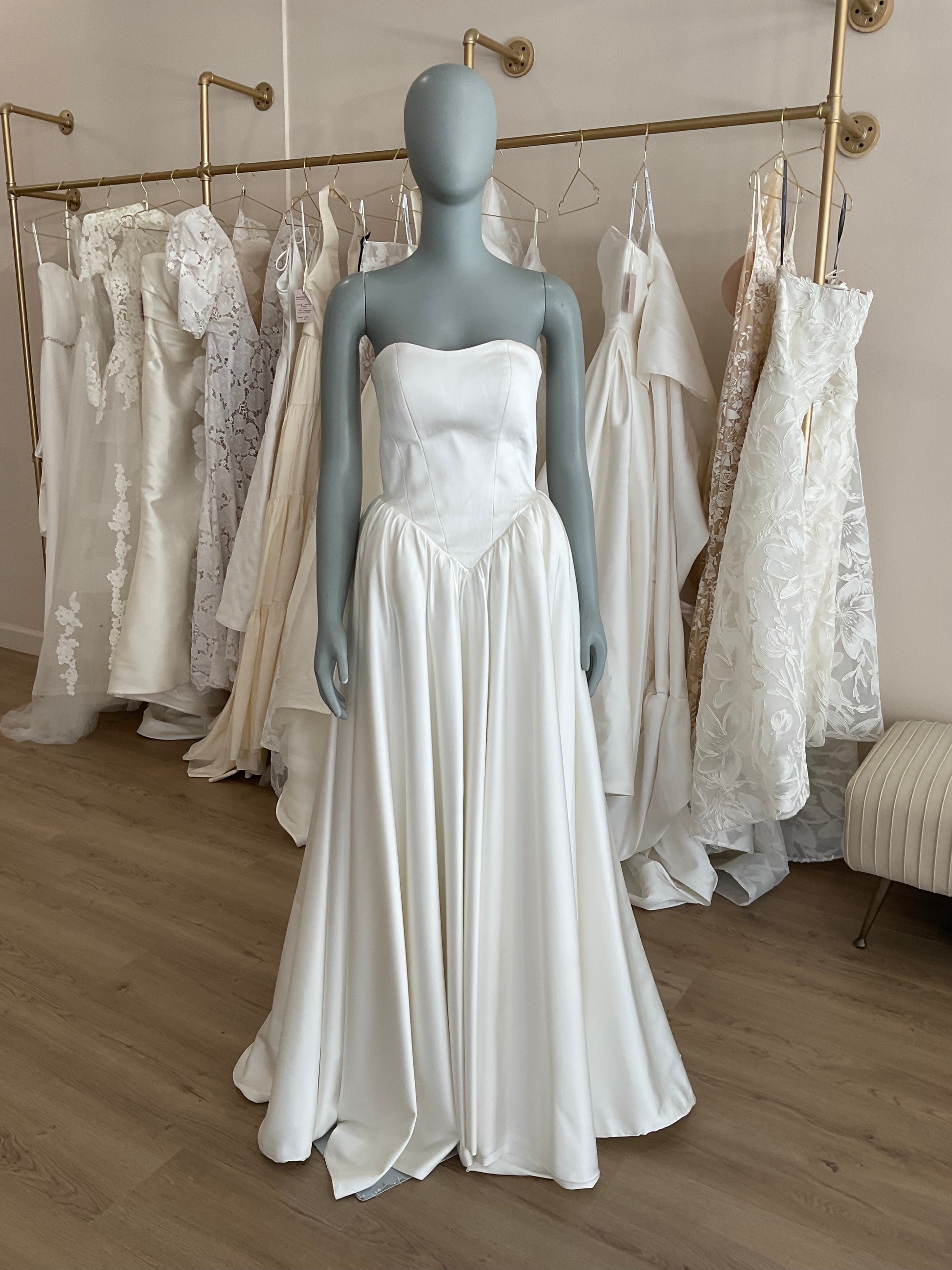 The Sky Mor Silk Basque Waist A-Line gown is a timeless choice for the bride seeking effortless elegance. Crafted from luxurious silk, this gown features a structured, strapless bodice with clean boning and a flattering basque waistline that elongates the torso. The A-line skirt gently flows from the hips, creating a graceful silhouette that moves beautifully with every step. Minimalist yet sophisticated, this gown is perfect for the modern romantic who desires a refined and classic bridal look with a touch of couture charm.