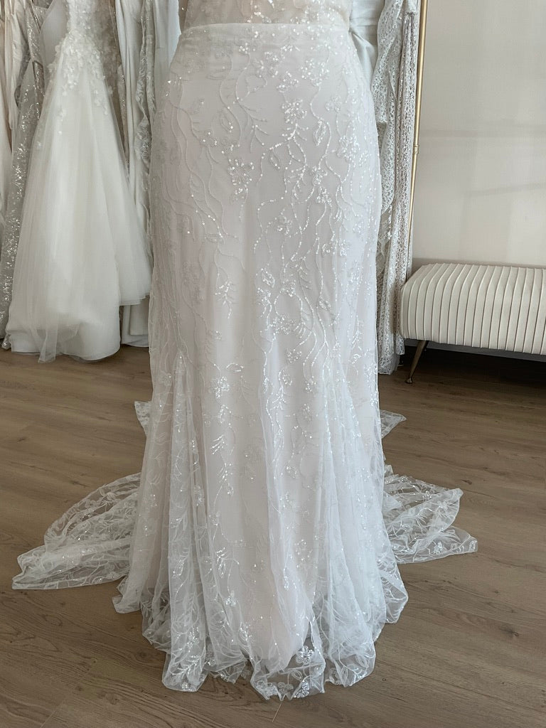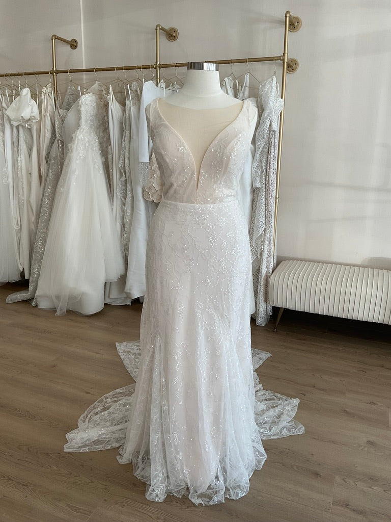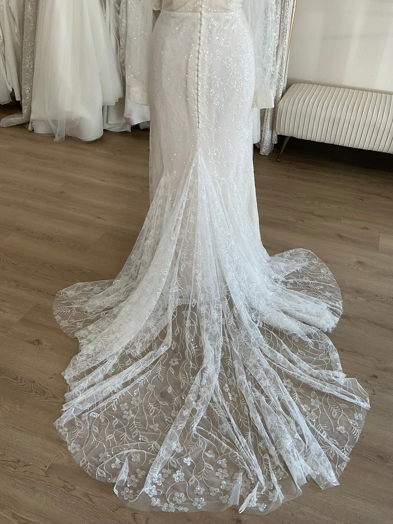 NOT LOCAL TO LA-Schedule a free 30 minute virtual fitting appointment before it's too late. Our inventory of hard to find wedding dresses is limited, and this is the only dress in stock and is available on a first come, first-served basis. Click here for a virtual Appointment