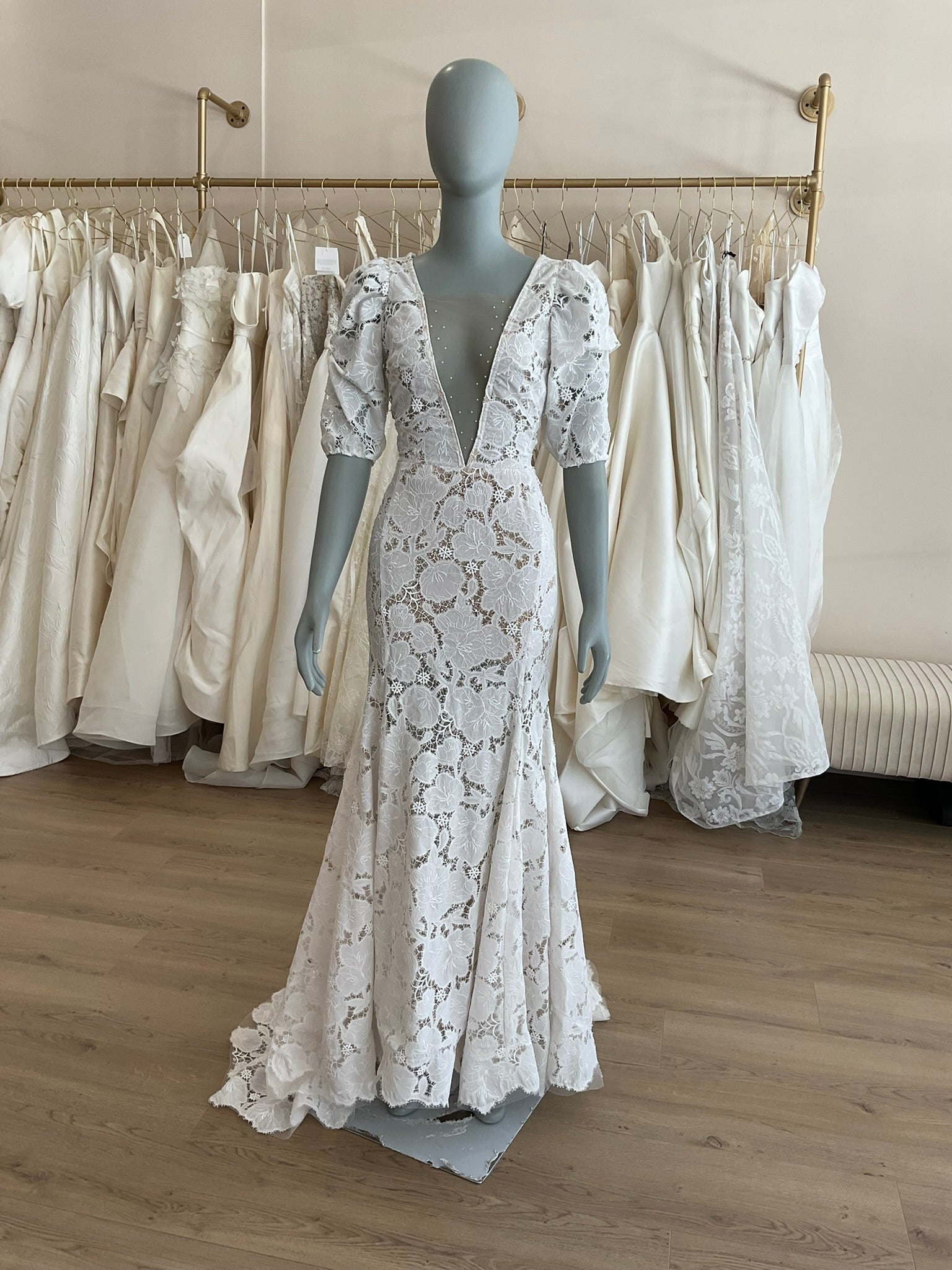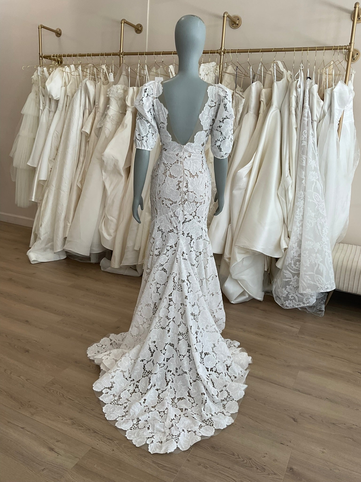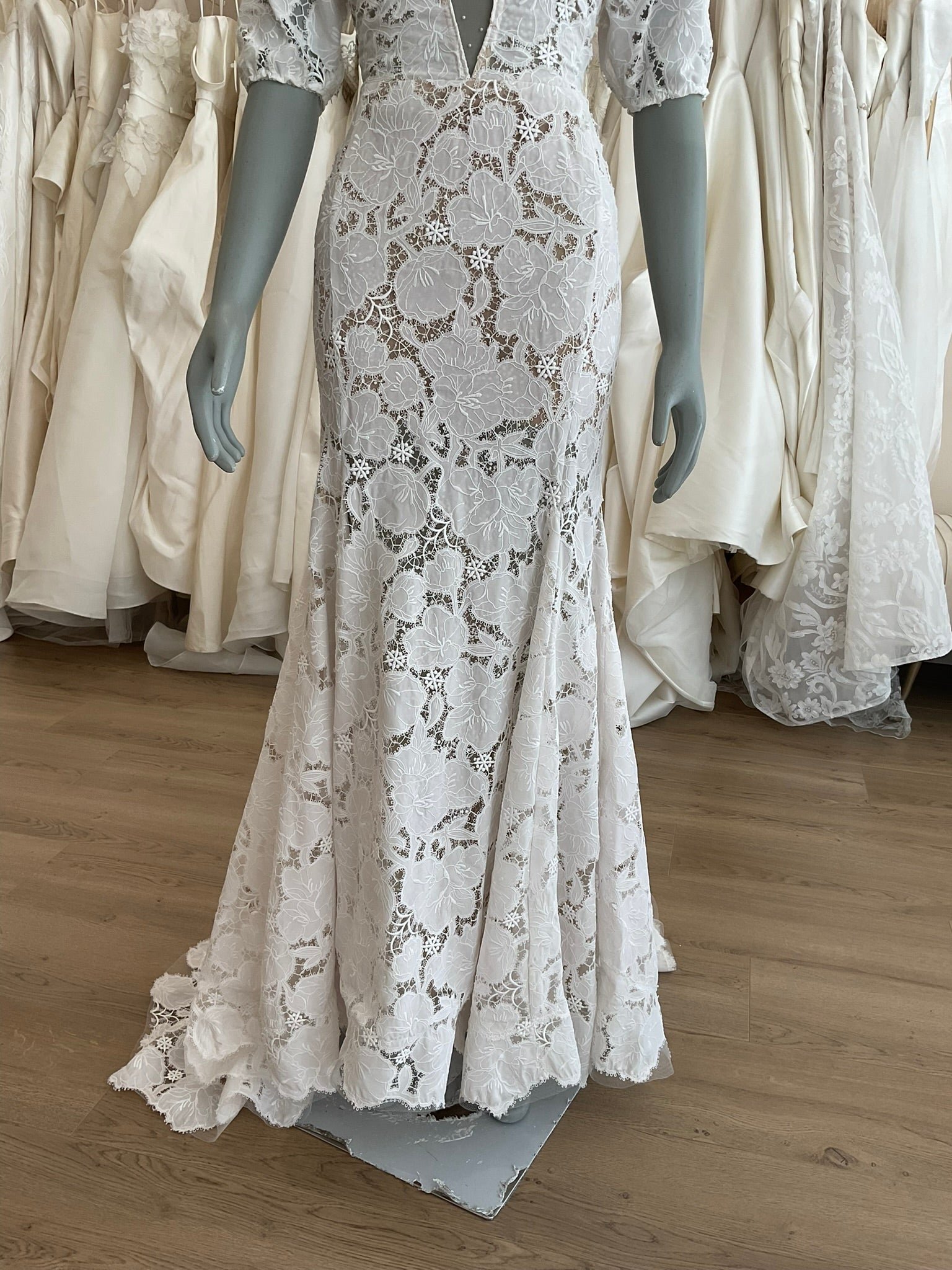 The Tal Kedem Sunny gown is a romantic lace dream for the fashion-forward bride seeking timeless elegance with a modern twist. Crafted in an all-over floral lace, this fitted mermaid silhouette hugs the body beautifully, flaring subtly at the hem for graceful movement. The bold lace lays on top of a subtle nude lining and a layer of glitter tulle for added sparkle. The plunging illusion neckline is lightly adorned with pearls, adding just the right amount of sparkle while maintaining a soft, ethereal look. Delicate puff sleeves with gentle gathering create a vintage-inspired charm, while the open scoop back adds a sultry touch. The structured bodice offers a flattering shape, and the scalloped edges of the chapel-length train finish the gown with a whisper of whimsy. Perfect for the bride envisioning a sun-drenched outdoor ceremony or an effortlessly chic celebration.