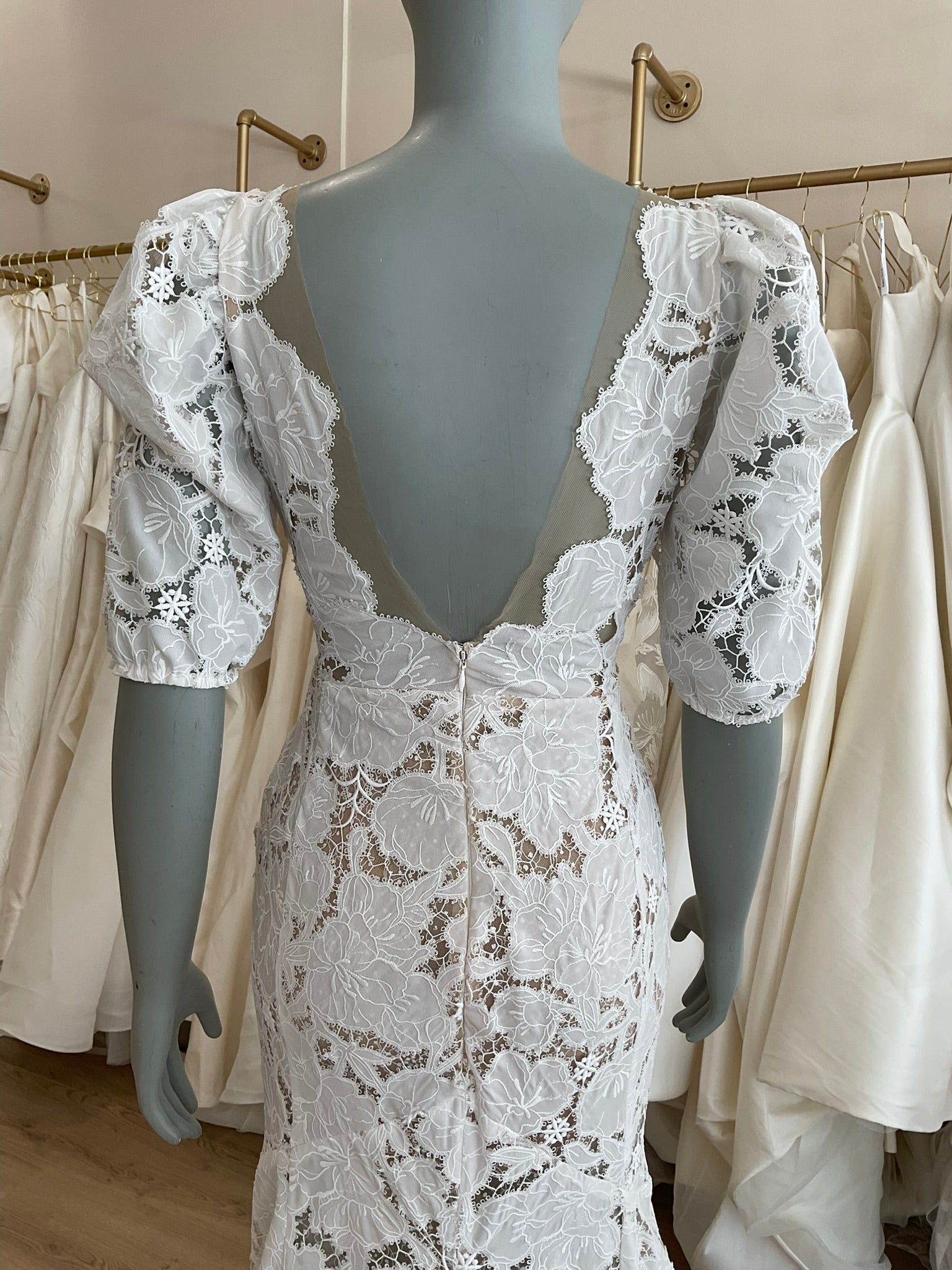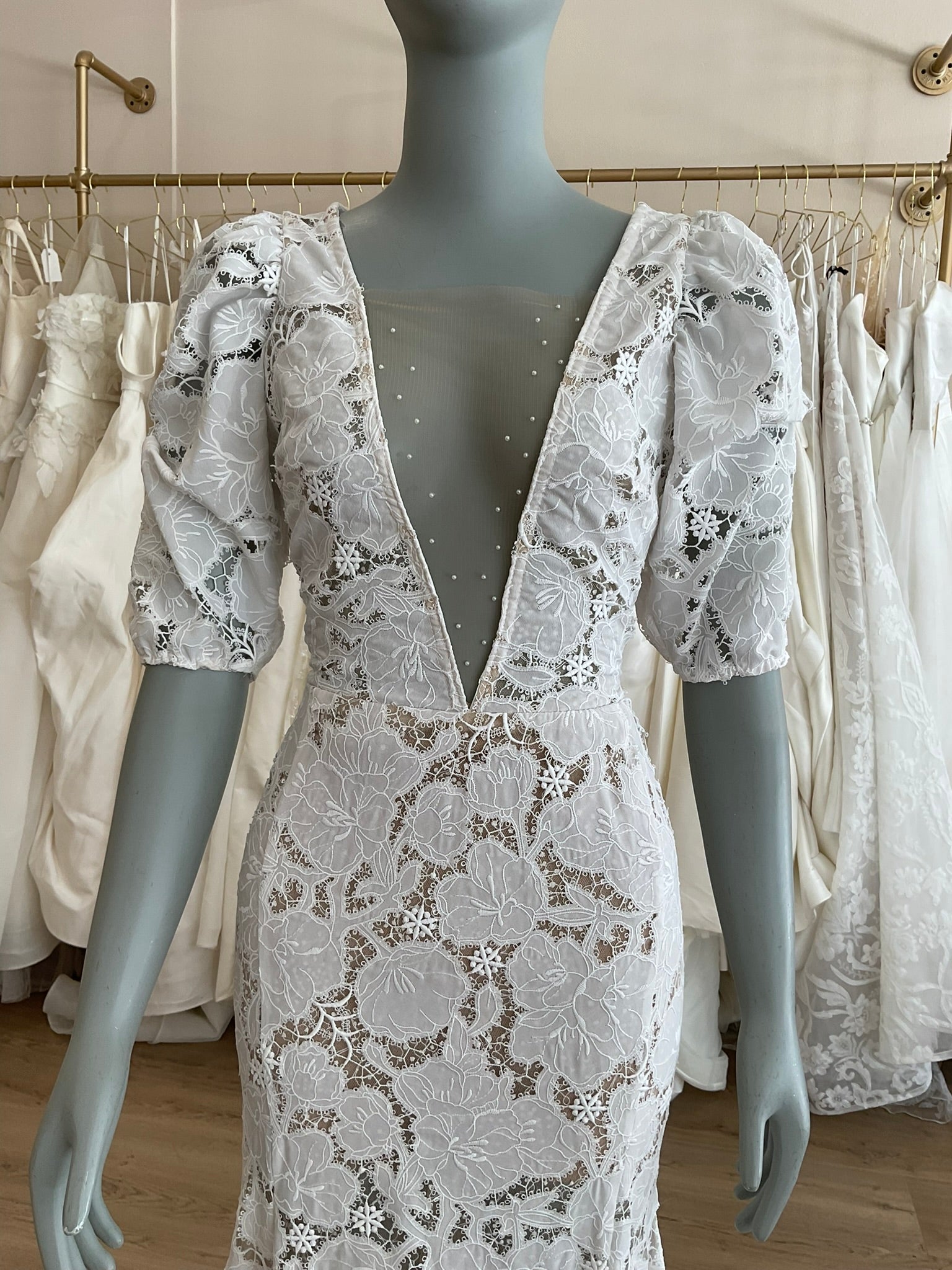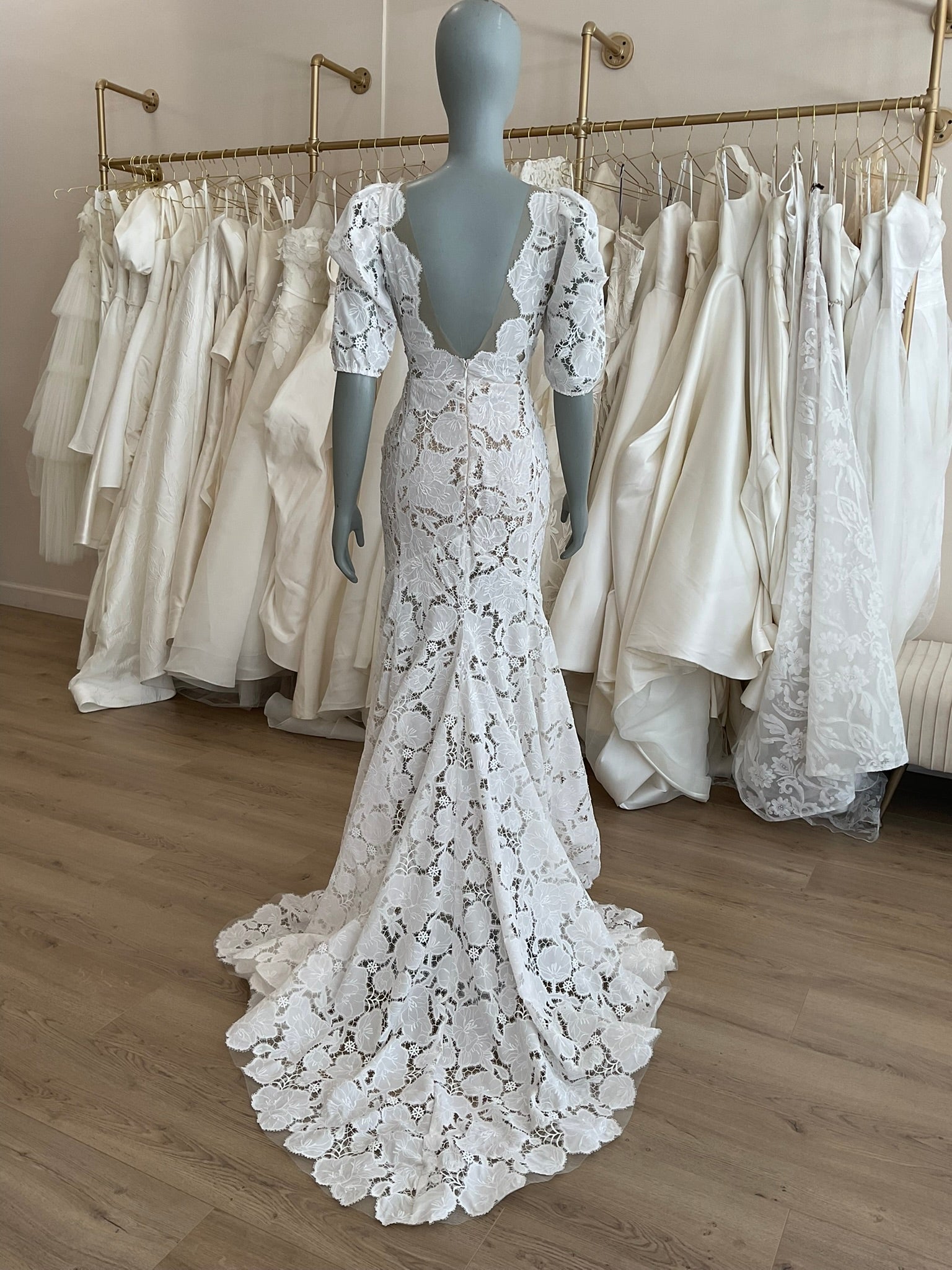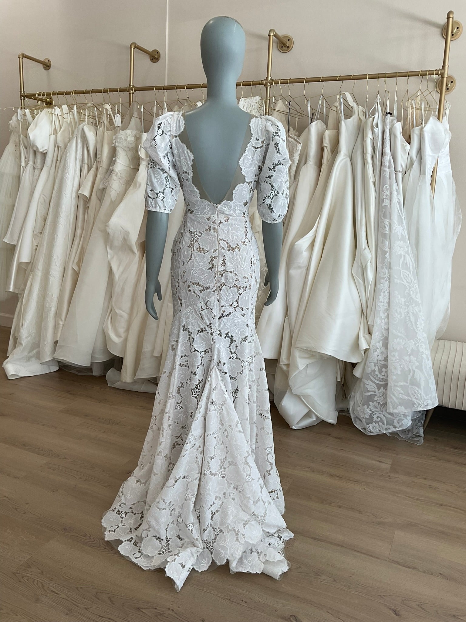 The Tal Kedem Sunny gown is a romantic lace dream for the fashion-forward bride seeking timeless elegance with a modern twist. Crafted in an all-over floral lace, this fitted mermaid silhouette hugs the body beautifully, flaring subtly at the hem for graceful movement. The bold lace lays on top of a subtle nude lining and a layer of glitter tulle for added sparkle. The plunging illusion neckline is lightly adorned with pearls, adding just the right amount of sparkle while maintaining a soft, ethereal look. Delicate puff sleeves with gentle gathering create a vintage-inspired charm, while the open scoop back adds a sultry touch. The structured bodice offers a flattering shape, and the scalloped edges of the chapel-length train finish the gown with a whisper of whimsy. Perfect for the bride envisioning a sun-drenched outdoor ceremony or an effortlessly chic celebration.