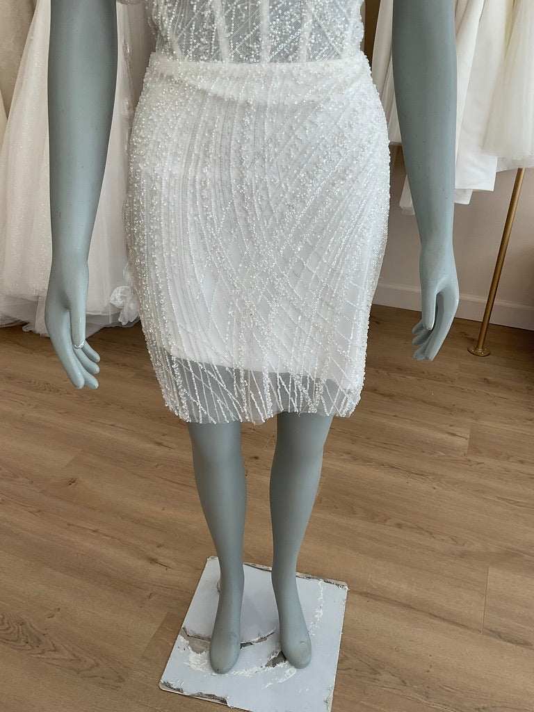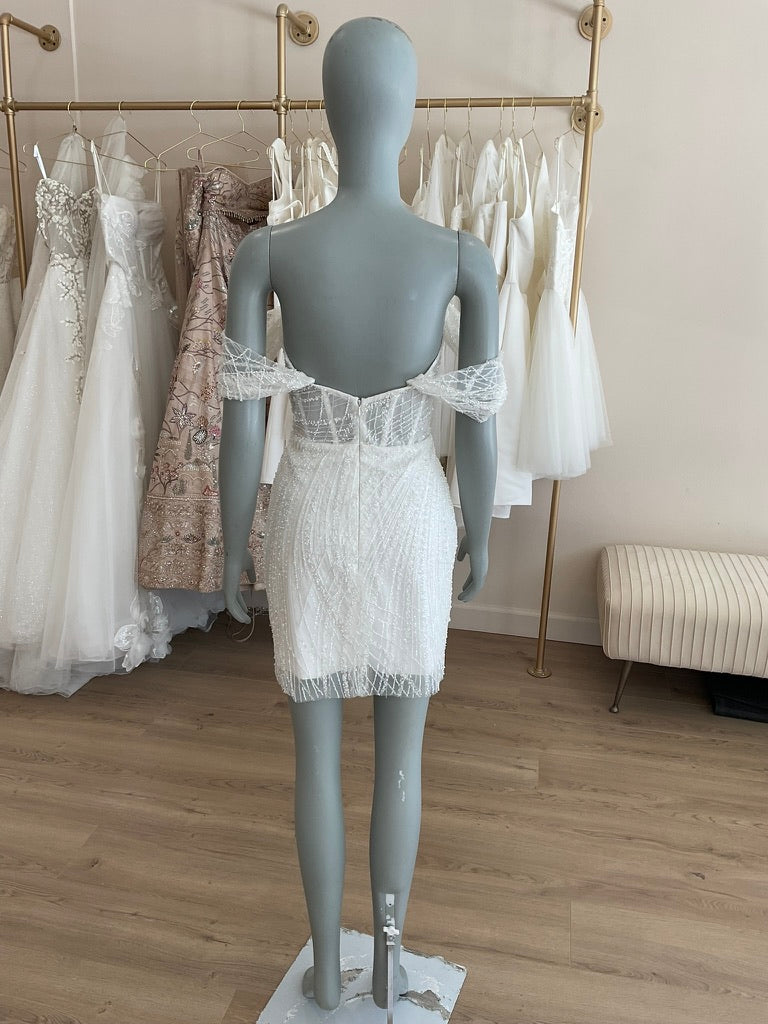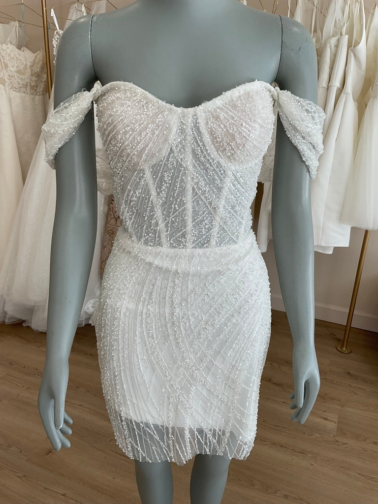 The Tara Lauren Holiday Mini is perfect for your second look. The subtly lined bodice has exposed boing and an underwire for ample support. The beaded fabric has linear lines to draw the eye to your waistline. The fabric drapes into a removable off the shoulder strap. The short mini skirt makes for an easy dress to wear.
