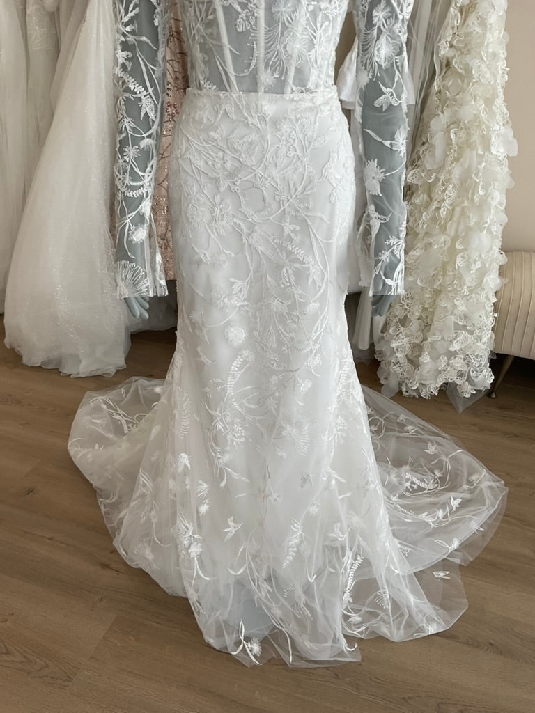 Info: The Tara Lauren Isadora is a romantic fit to flare gown. The subtly lined corset is layered with delicate vine like lace with texture flower appliques. The gown has a chapel length train.