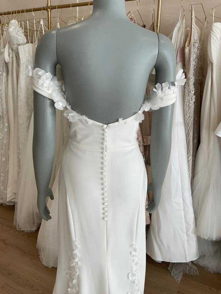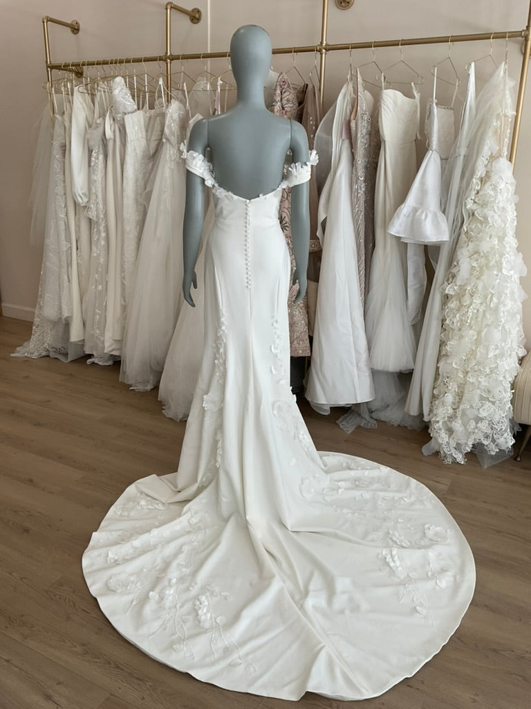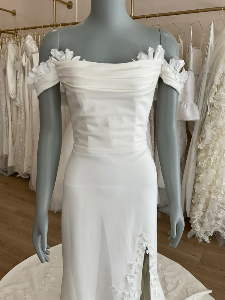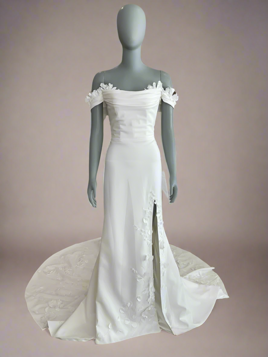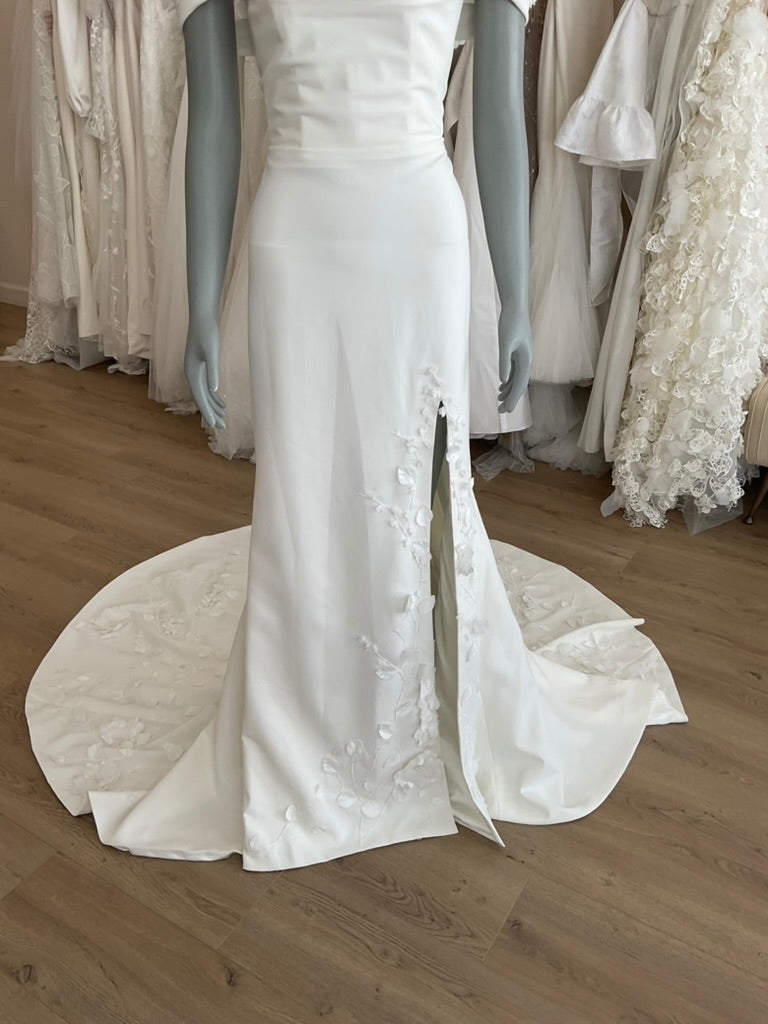 Info: The Tara Lauren Lana is modern fit to flare crepe gown. The uniformly pleated straight neckline is adorned with a subtle leaf applique that drops into an off the shoulder strap. The crepe skirt has a leg slit with complementary details that cascade into the chapel length train.