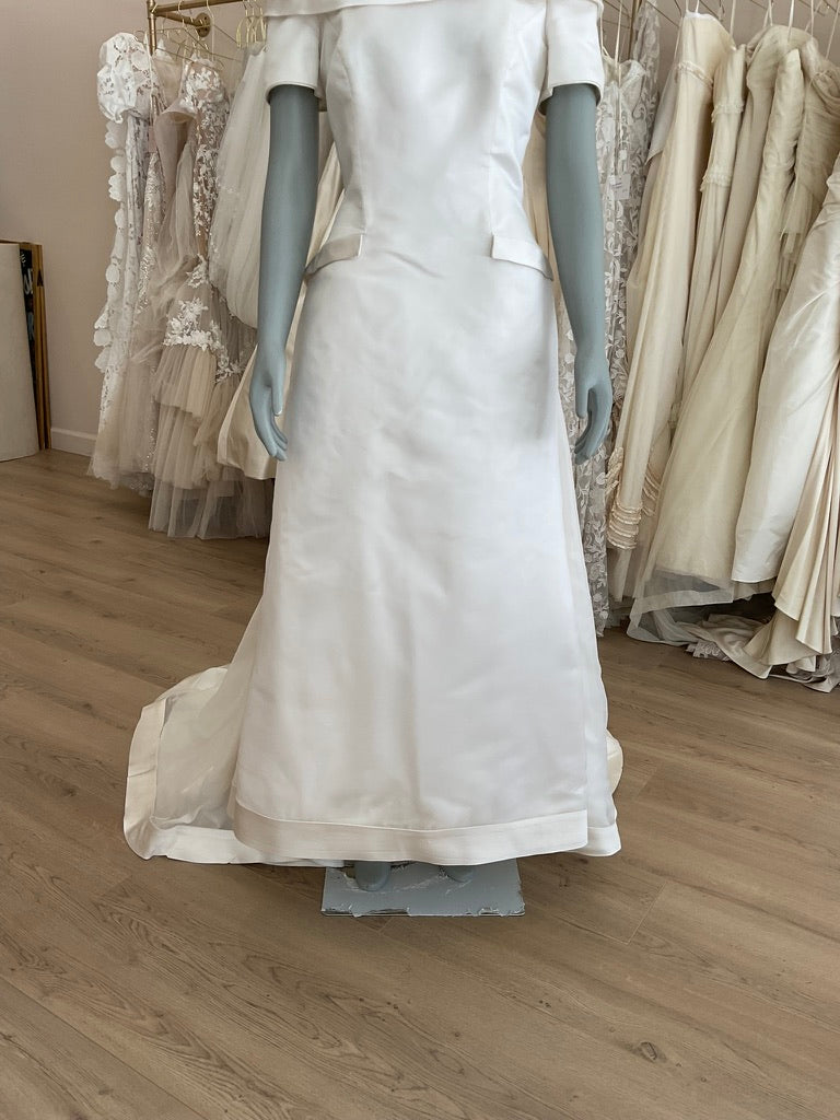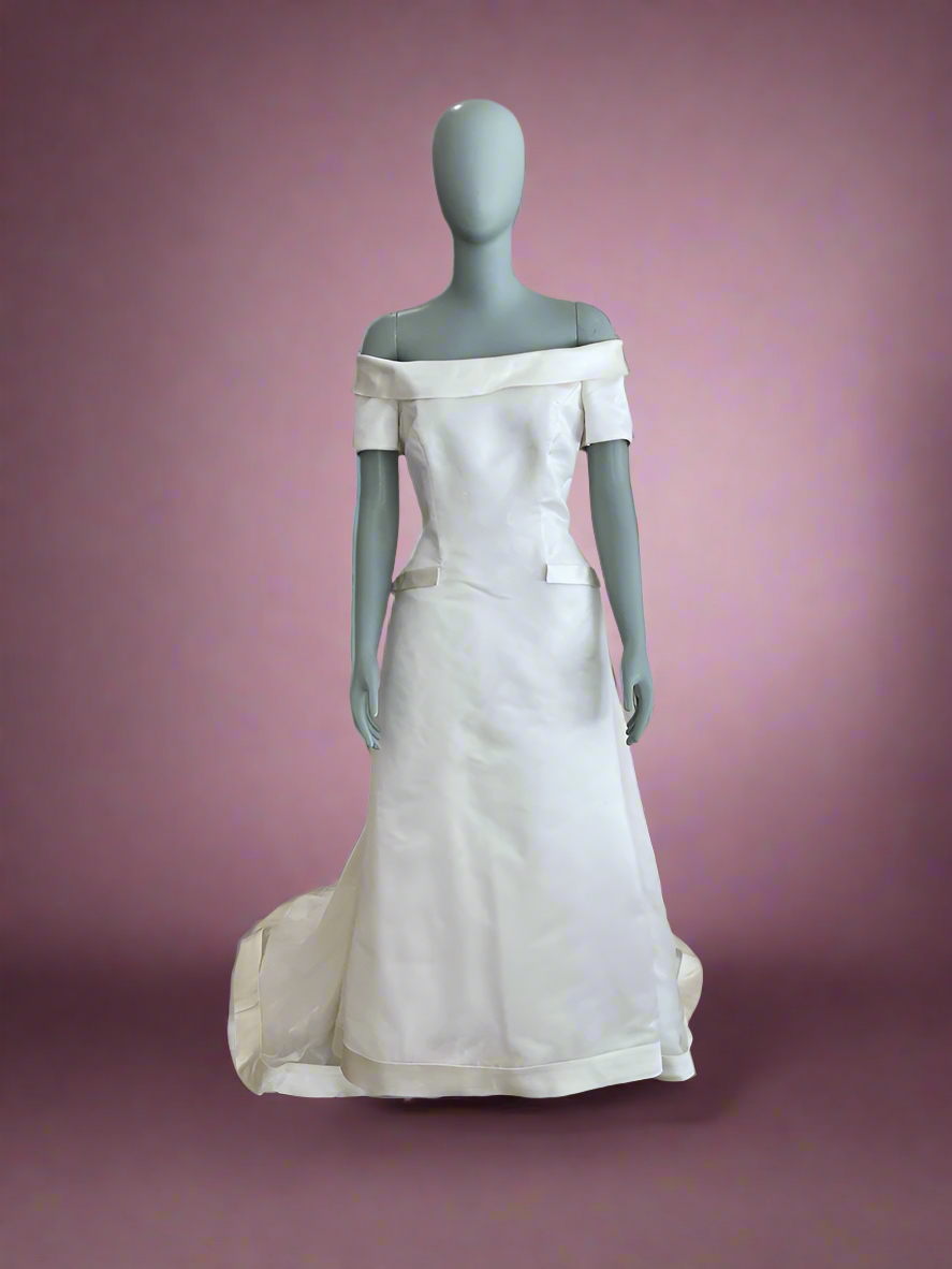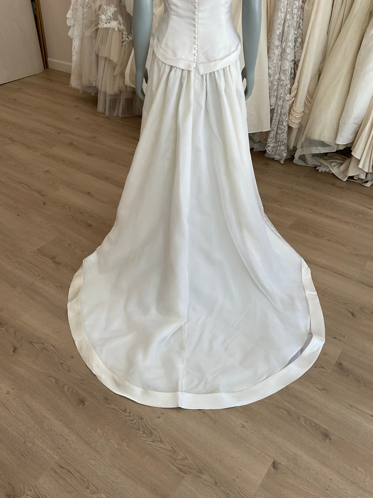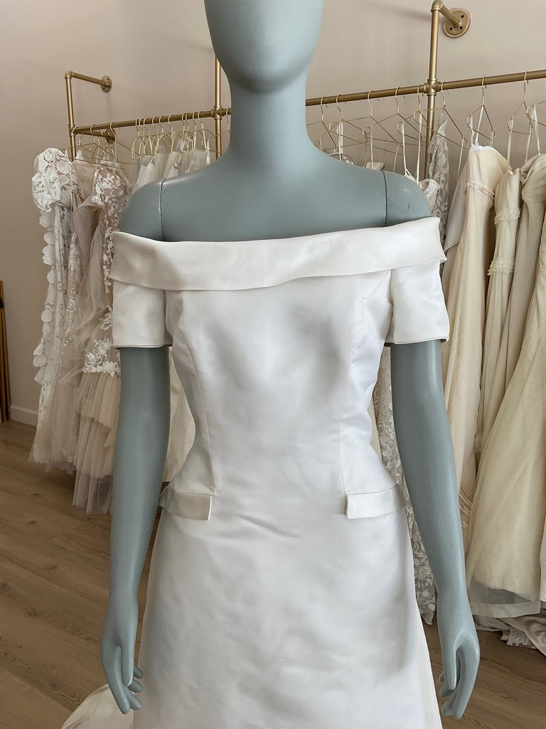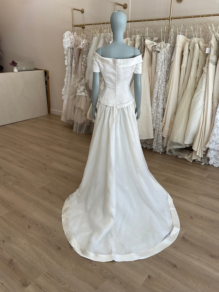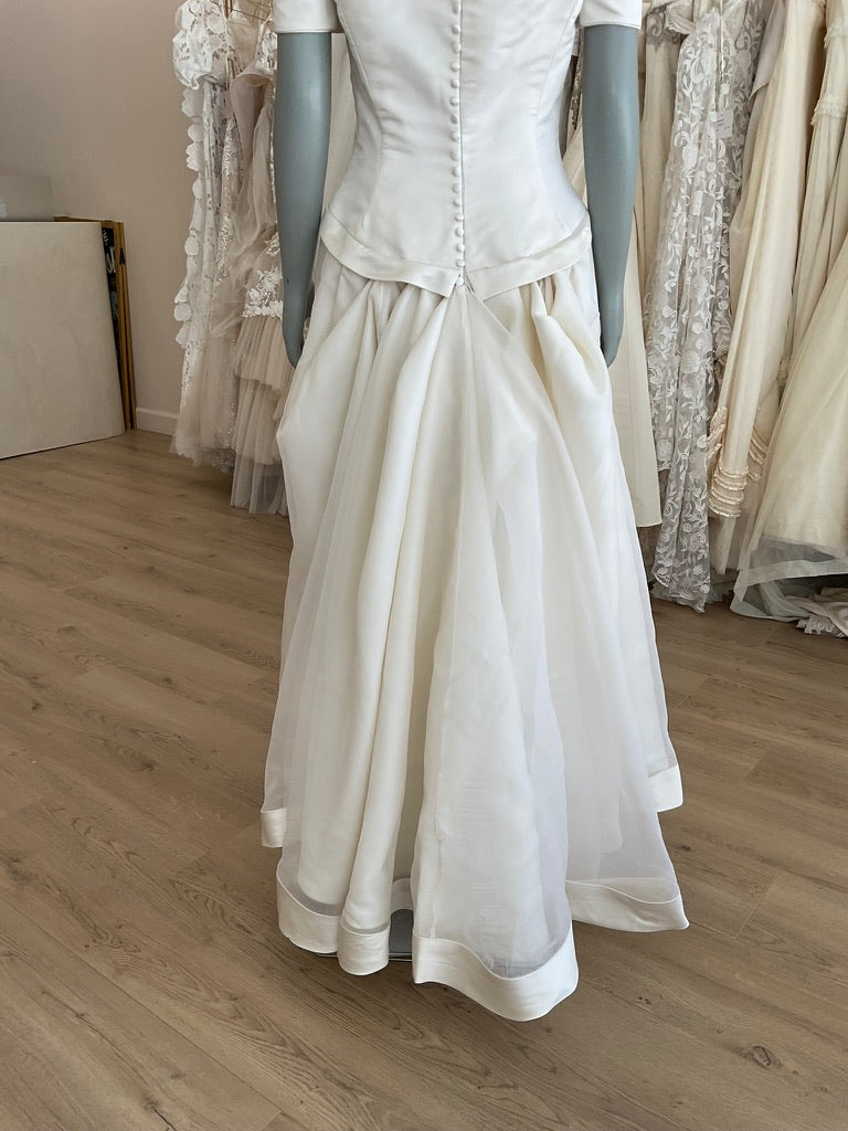 The vintage organza wedding dress has a timeless off the shoulder neckline with a cap sleeve sleeve. The strap has an elastic to stay up on your shoulders. The gown is accented with a satin lapel neckline and hip details that wrap the back and finish the hem. The gown has a 5 point english bustle. There are a couple of spots on one shoulder and along the right side of the zipper.
