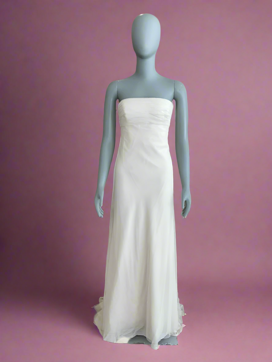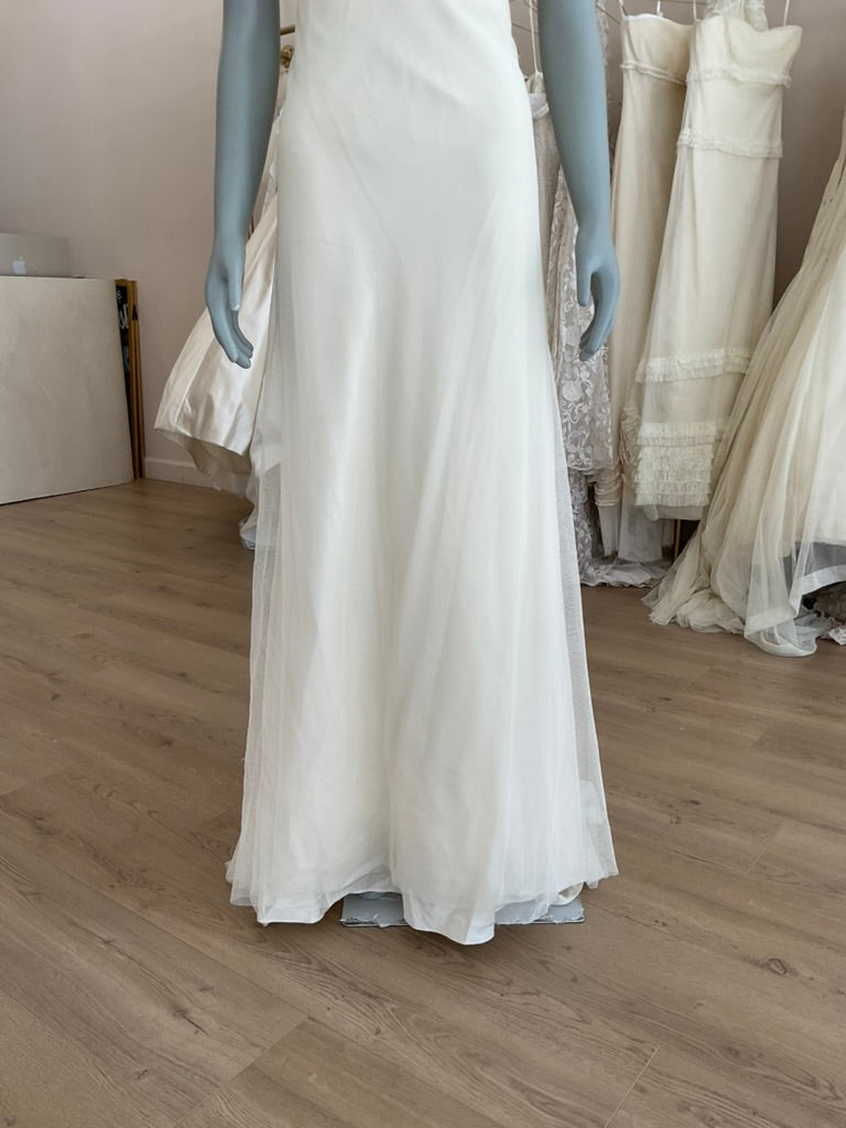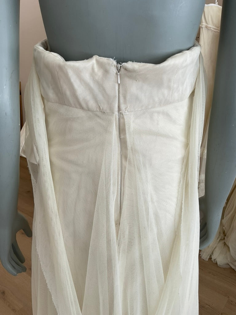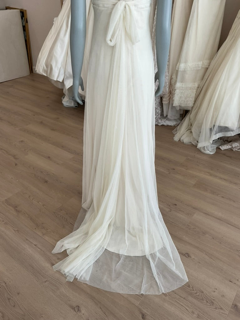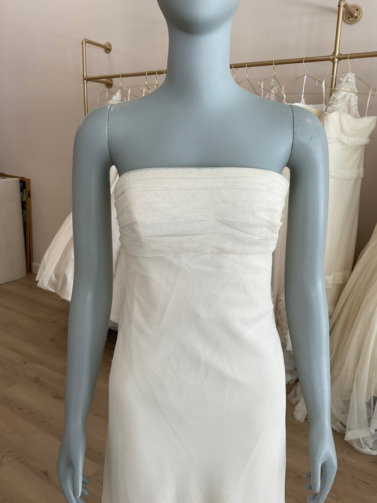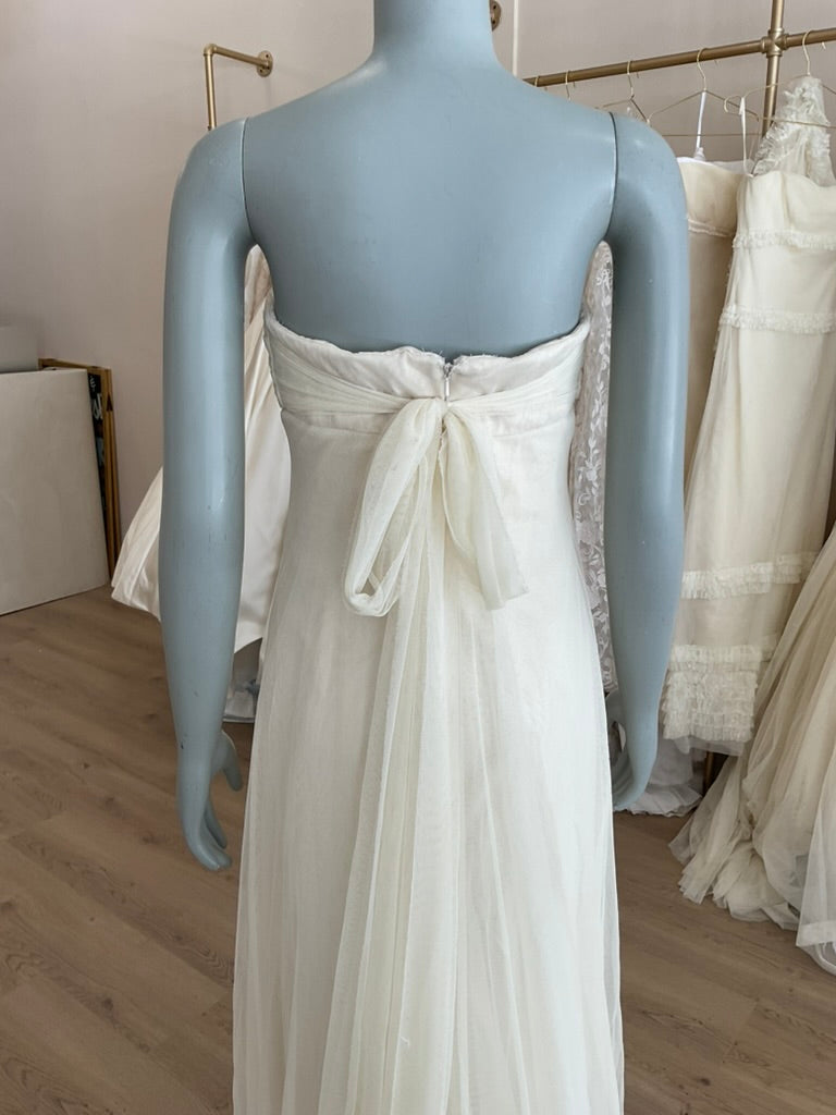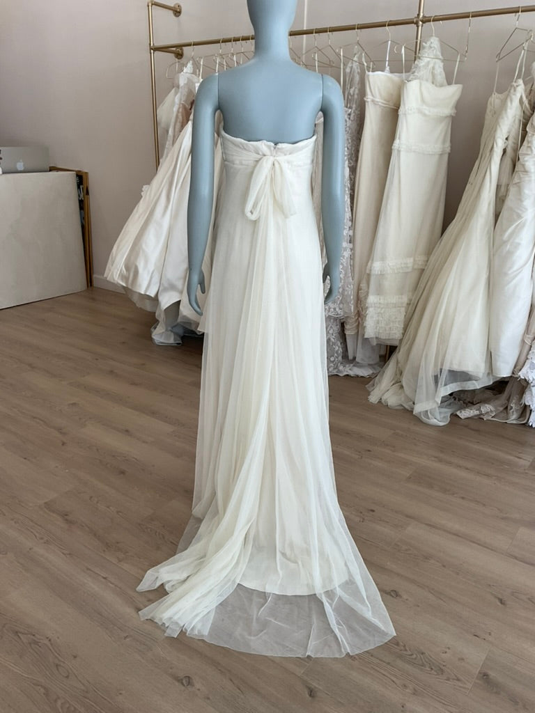 The vintage Vera Wang is for the minimalist bride. The straight across empire waist pleated top has a tie back for a good fit. The simple cut of the gown screams effortless! The gown has a soft sweep train. The lining and the outer layer is a one point bustle on each. There is a bit of wear the top of the gown along the zipper.