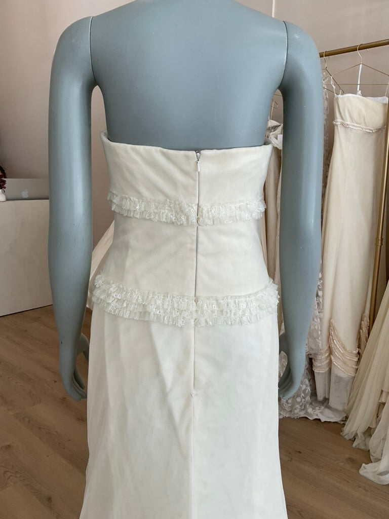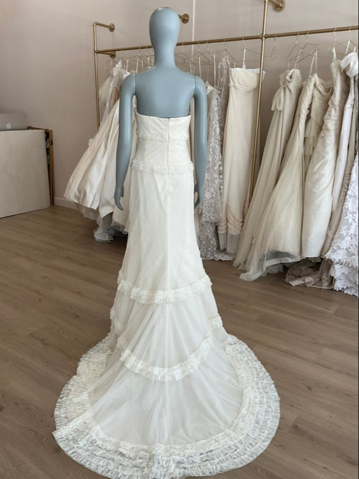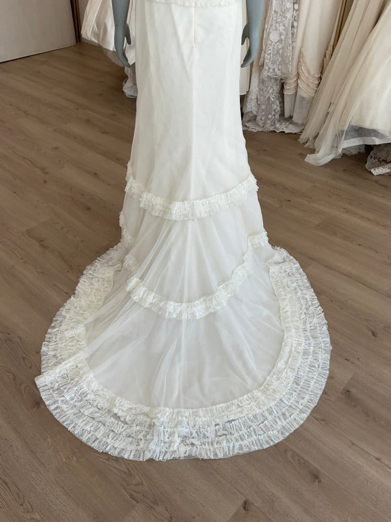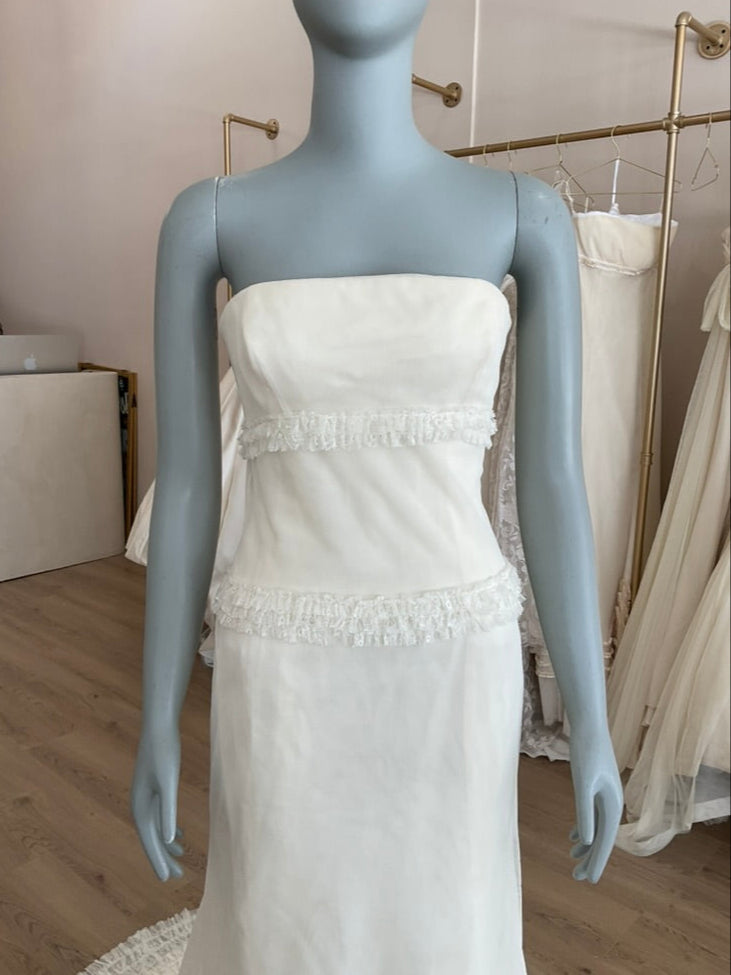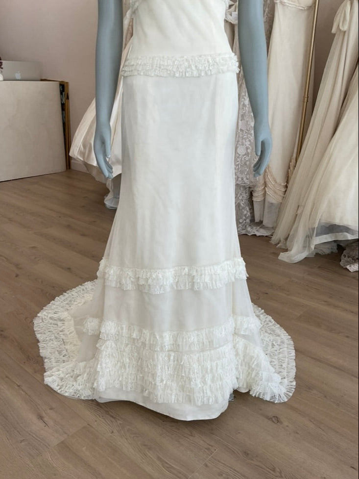 The vintage Vera Wang wedding dress is a unique fit to flare. Made of tulle. The straight across neckline has an empire waist layered with a tightly pleated lace detail. The lace trim work is also at the drop waist and hemline where the density dances with you. This gown has not be altered but the top layer is a has shrunk 2''.