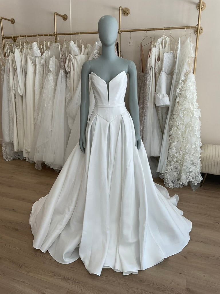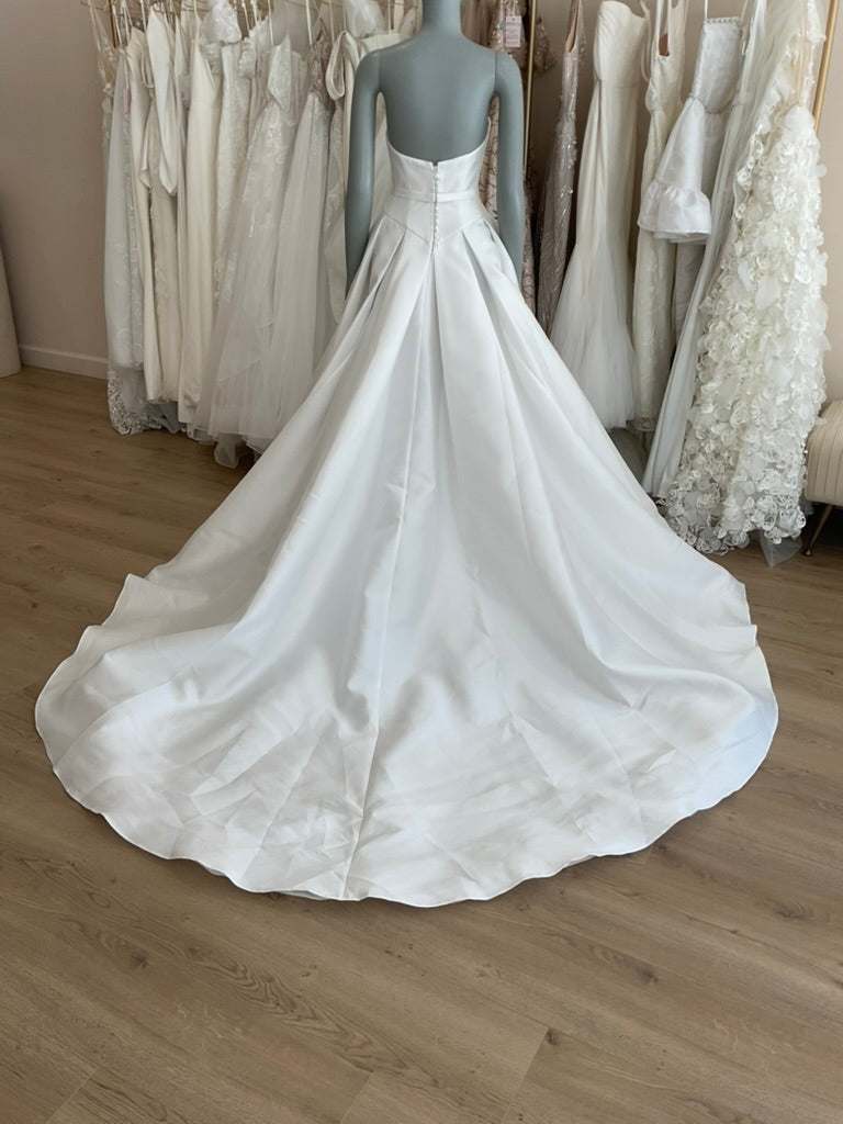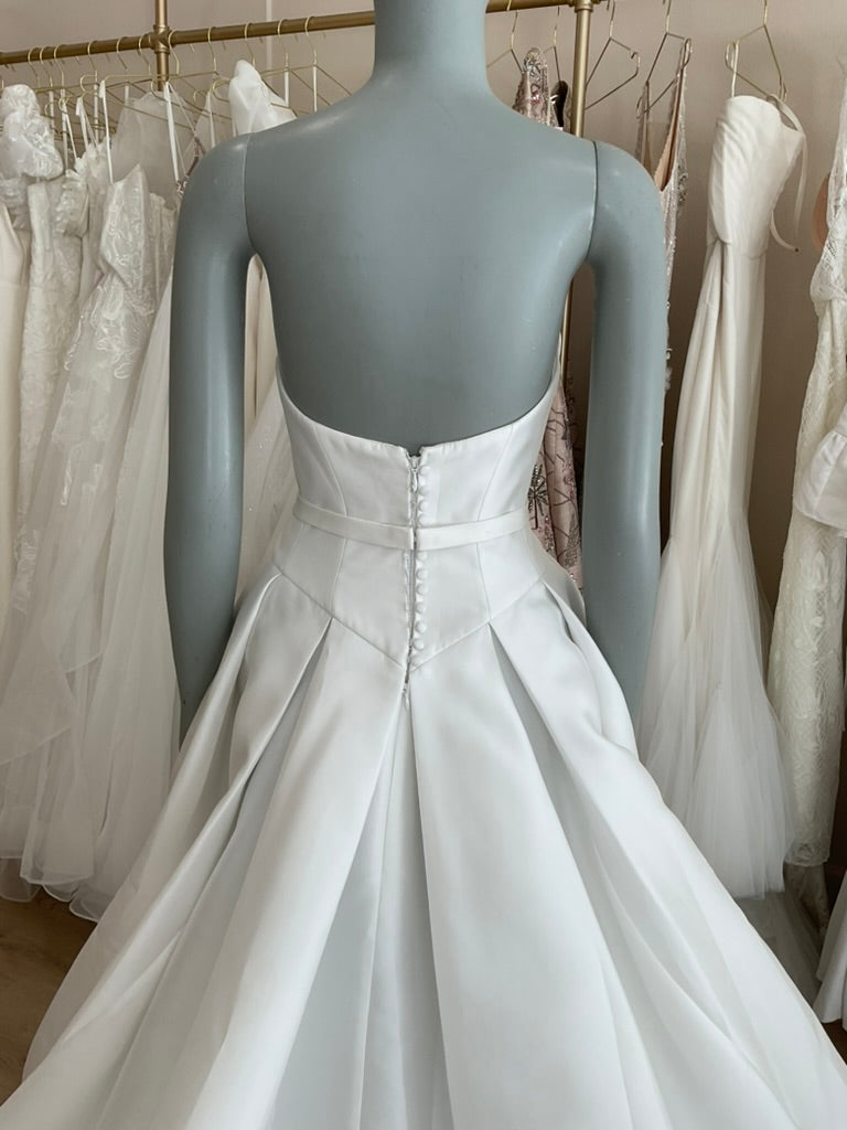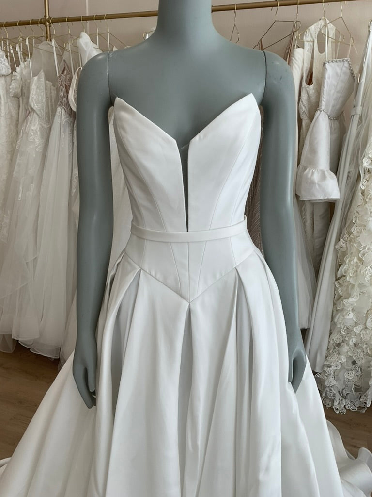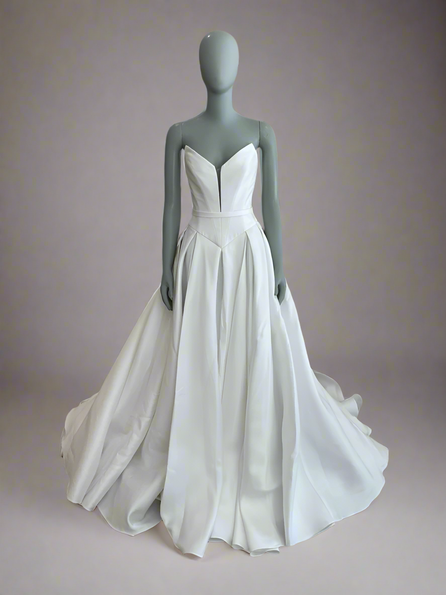 Info: The Valentini Spose Noto gown is dramatic mikado ballgown. The cat eye bodice had a unique cut out down the center of the neckline. The basque waist is accentuated with box pleats in the skirt for tons of volume.