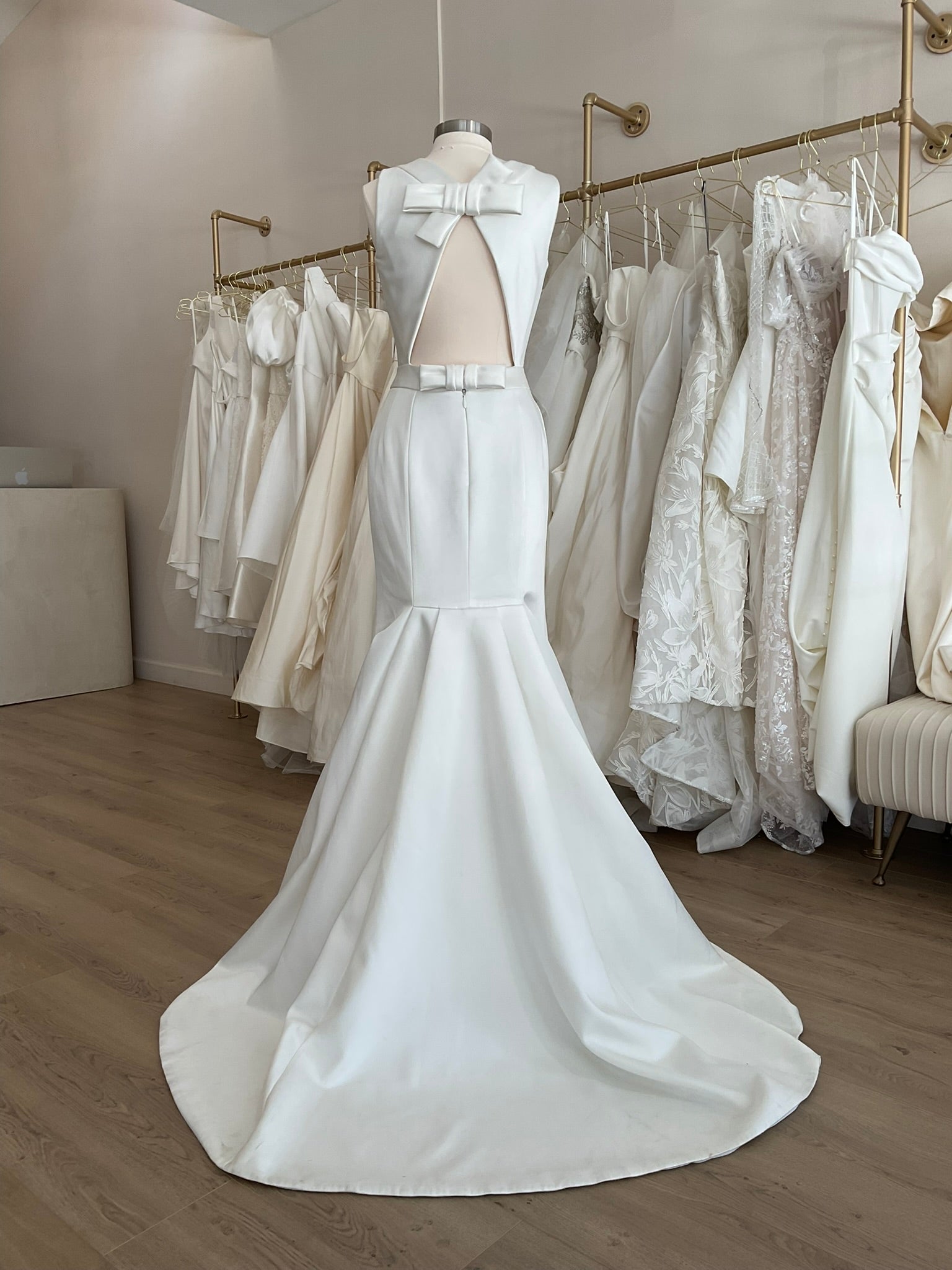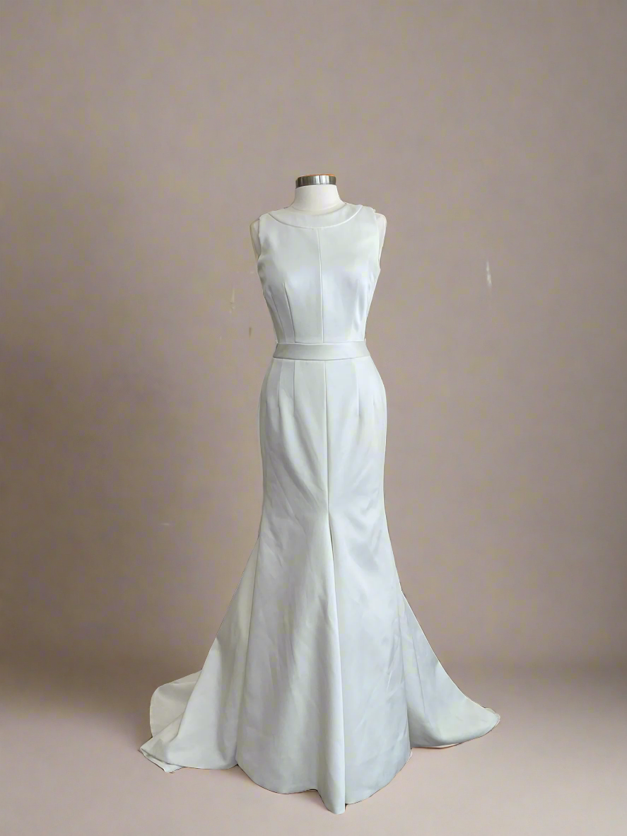 Info: The Viktor and Rolf VRM 0005 is a special duchess satin mermaid gown. The high jewel neckline is a classic complement unique architectural back. The open neckline has. bow snap closure. The modern seam work ensures a great fit and flare in the skirt.